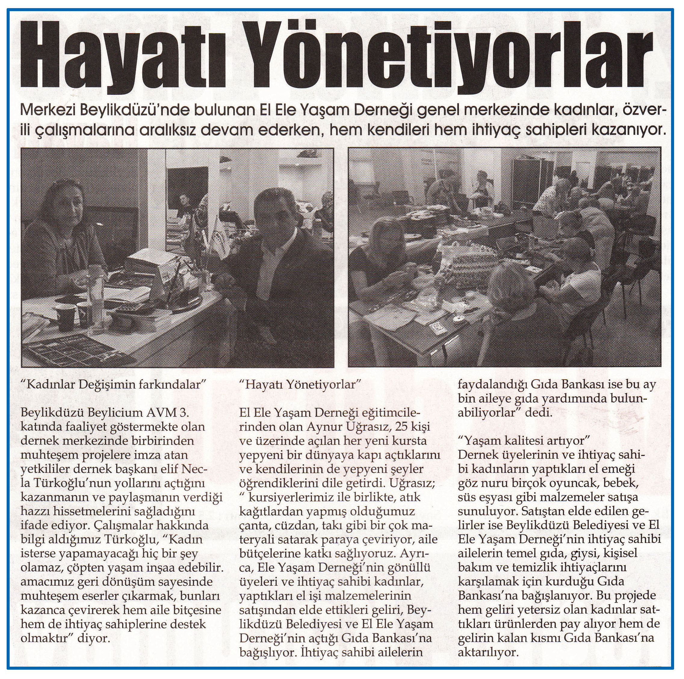 16 Ekim 2016 tarihli "BEYLİKDÜZÜ" gazetesi. Merkezi Beylikdüzü'nde bulunan Ele Ele Yaşam Derneği genel merkezinde kadınlar, özverili çalışmalarına aralıksız devam ederken, hem kendileri hem ihtiyaç sahipleri kazanıyor.