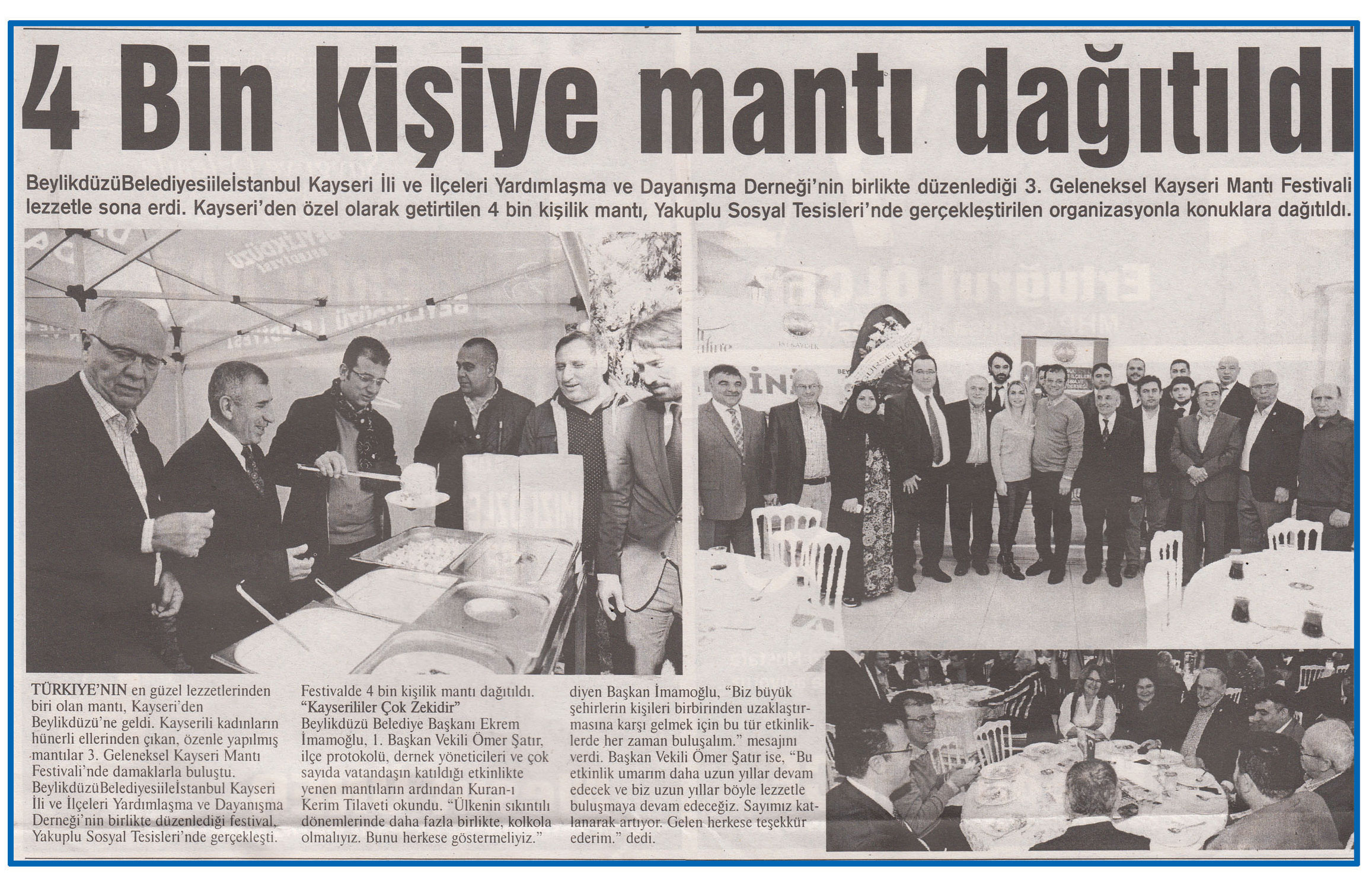 8 KASIM 2016 tarihli ''MARMARA'' gazetesi. Beylikdüzü Belediyesi ile İstanbul Kayseri İli ve İlçeleri Yardımlaşma ve Dayanışma Derneği'nin birlikte düzenlediği 3. Geleneksel Kayseri mantı festivali lezzetle sona erdi. Kayseri'den özel olarak getirtilen 4 bin kişilik mantı,Yakuplu Sosyal Tesisleri'nde gerçekleştirilen organizasyonla konuklara dağıtıldı.