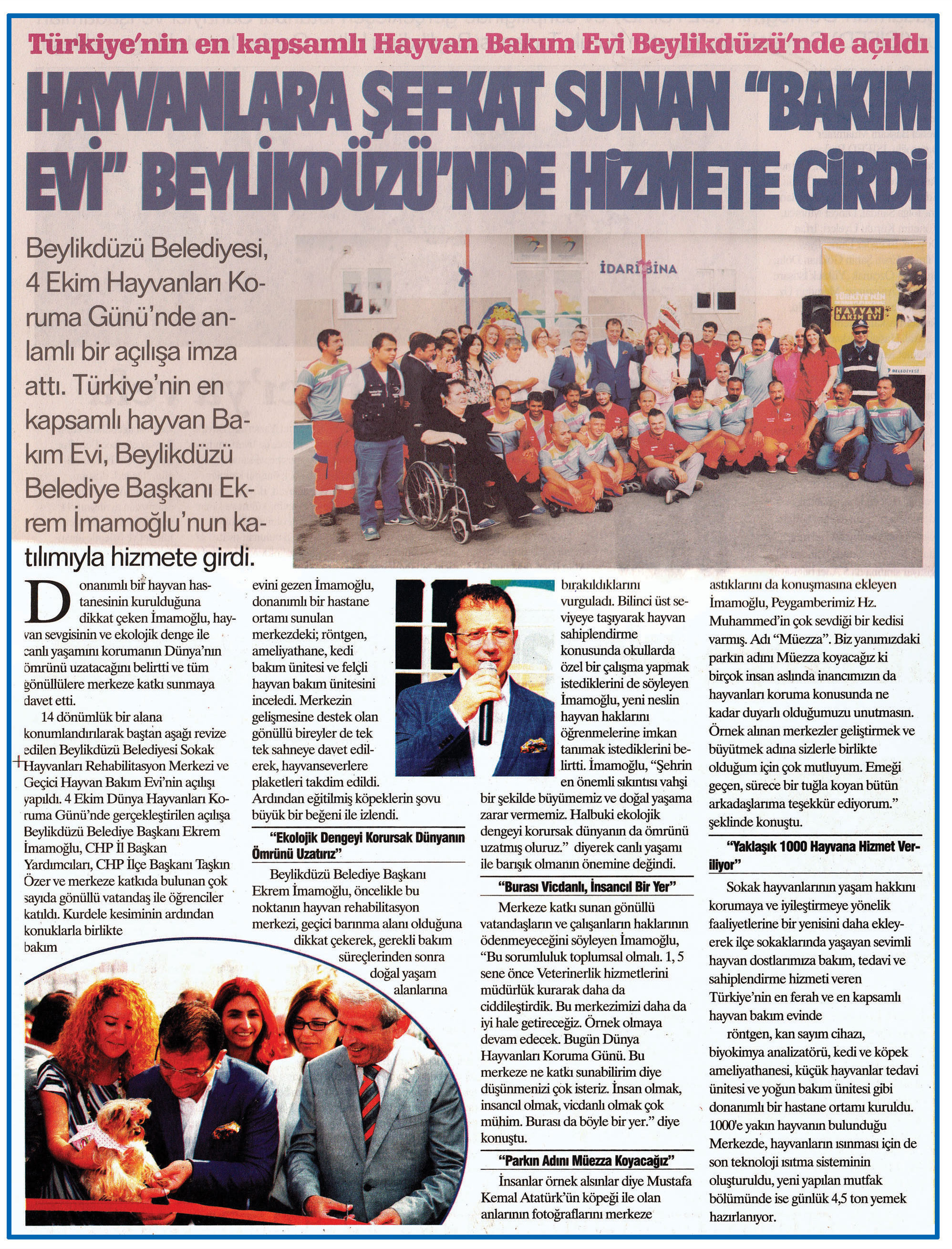10 Ekim 2016 tarihli "GAZETE CADDE" gazetesi. Beylikdüzü Belediyesi, 4 Ekim Hayvanları Koruma Günü'nde anlamlı bir açılışa imza attı. Türkiye'nin en kapsamlı Hayvan Bakım Evi, Beylikdüzü Belediye Başkanı Ekrem İmamoğlu'nu katılımıyla hizmete girdi.