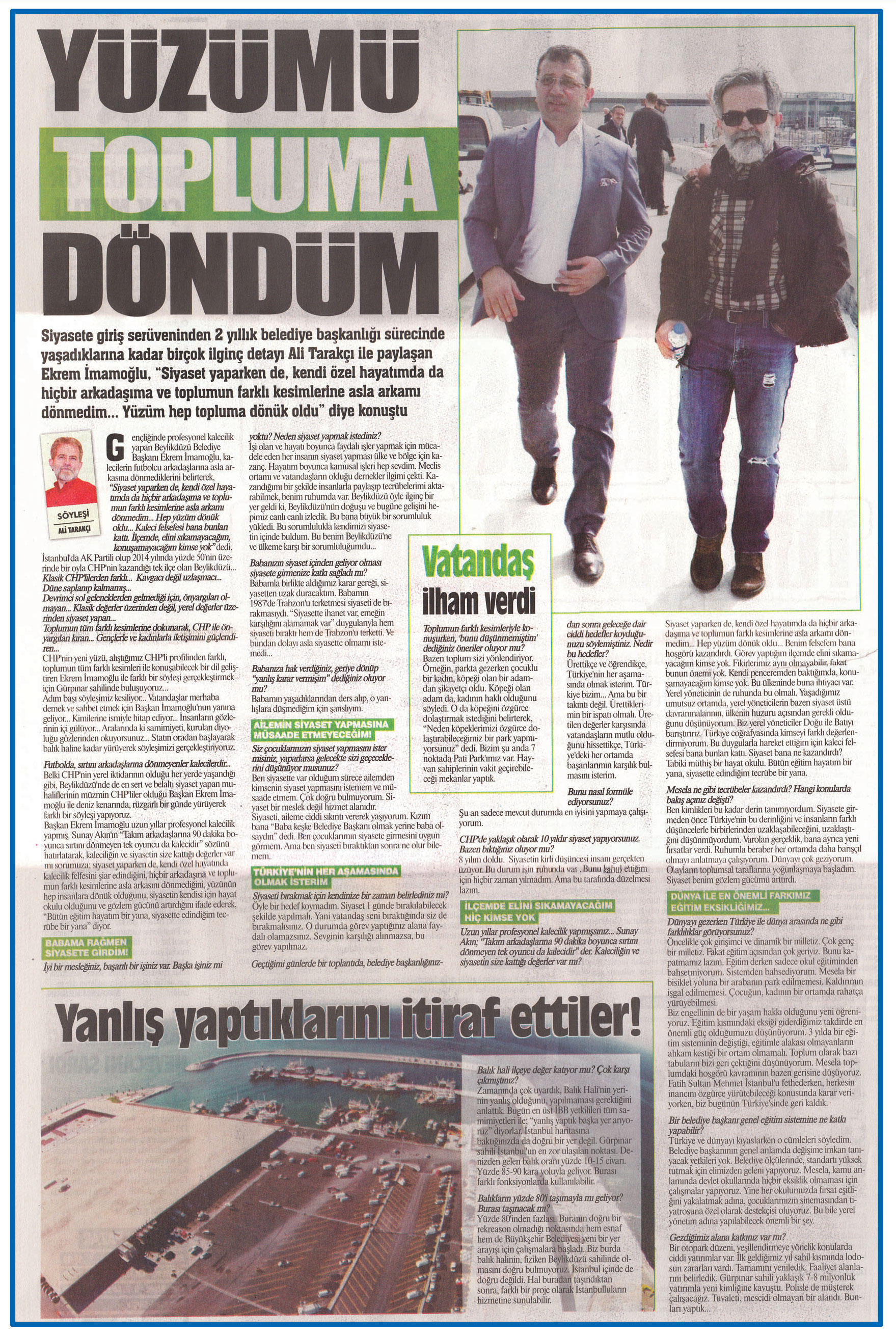 20 Nisan 2016 tarihli "GAZETE İSTANBUL" gazetesi. Siyasete giriş serüveninden 2 yıllık belediye başkanlığı sürecinde yaşadıklarınaa kadar birçok ilginç detayı Ali Tarakçı ile paylaşan Ekrem İmamoğlu, "Siyaset yaparken de, kendi özel hayatımda da hiçbir arkadaşıma ve toplumun farklı kesimlerine asla arkamı dönmedim... Yüzüm hep topluma dönük oldu" diye konuştu.