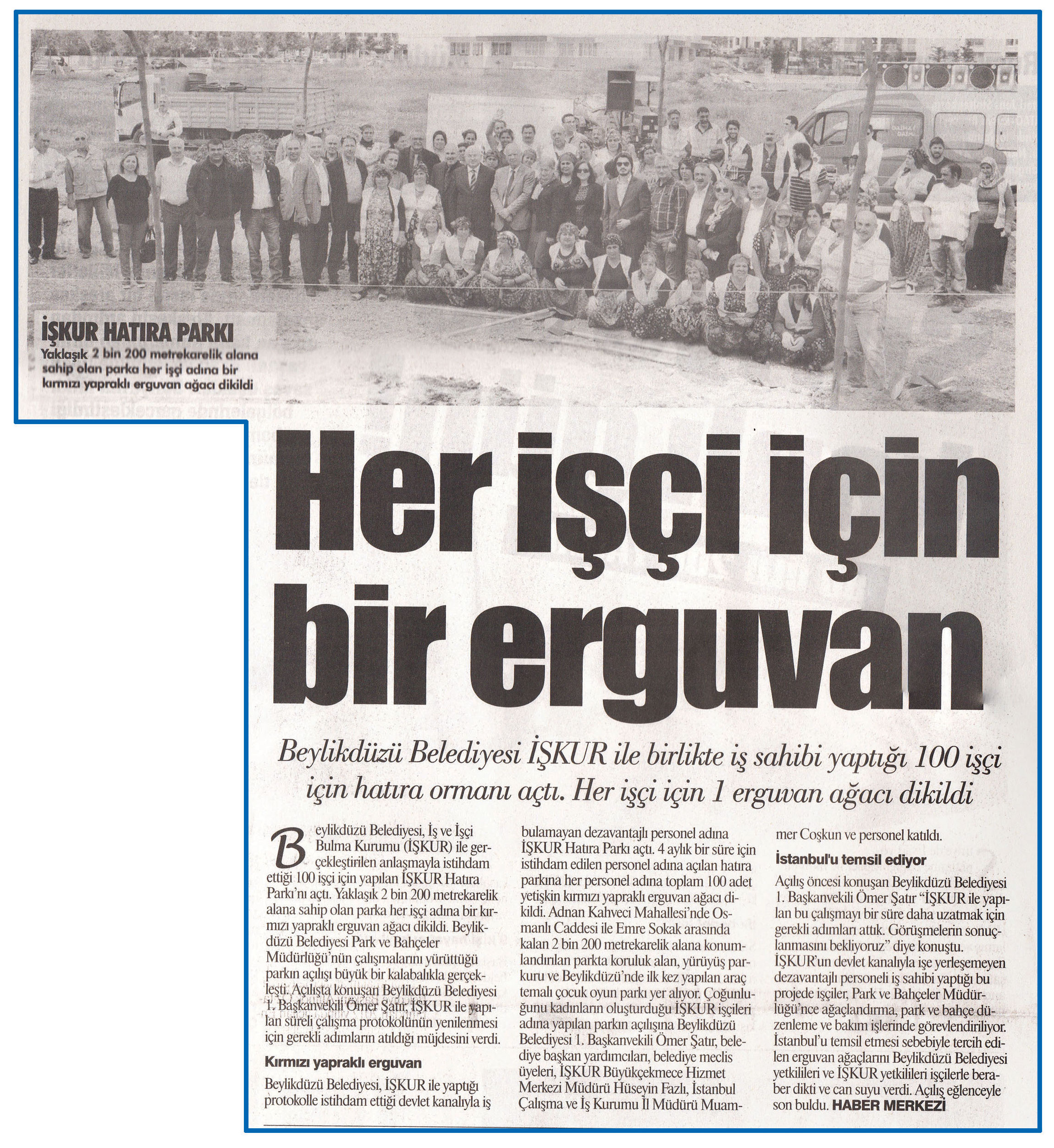 21 Nisan 2016 tarihli "GAZETE İSTANBUL" gazetesi. Beylikdüzü Belediyesi İŞKUR ile birlikte iş sahibi yaptığı 100 işçi için hatıra ormanı açtı. Her işçi için 1 erguvan ağacı dikildi.