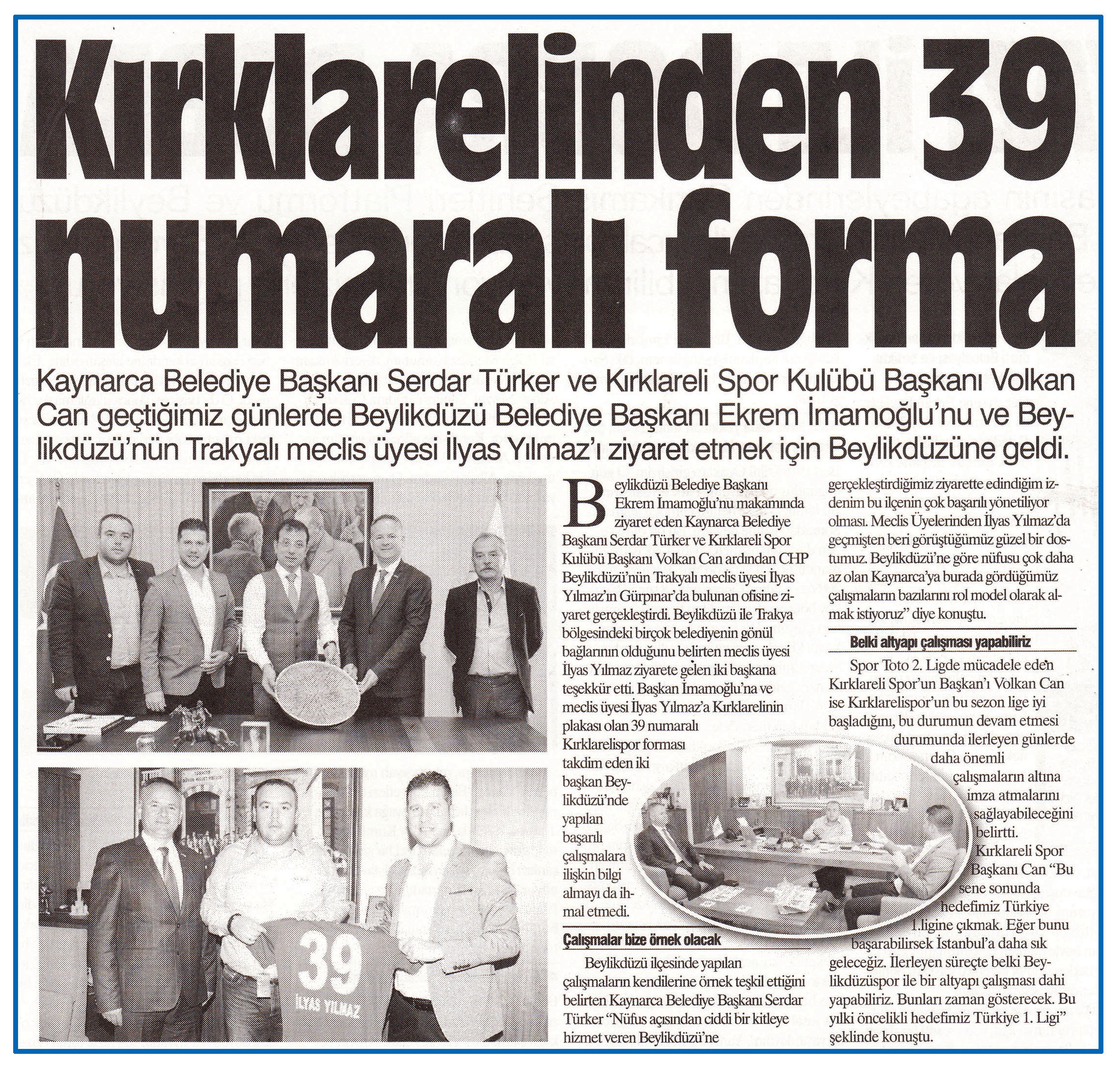 10 Ekim 2016 tarihli "GAZETE CADDE" gazetesi. Kaynarca Belediye Başkanı Serdar Türker ve Kırklarelispor Kulübü Başkanı Volkan Can, Beylikdüzü Belediye Başkanı Ekrem İmamoğlu'nu ve Beylikdüzü'nün Trakyalı meclis üyesi İlyas Yılmaz'ı ziyaret etmek için Beylikdüzü'ne geldi.