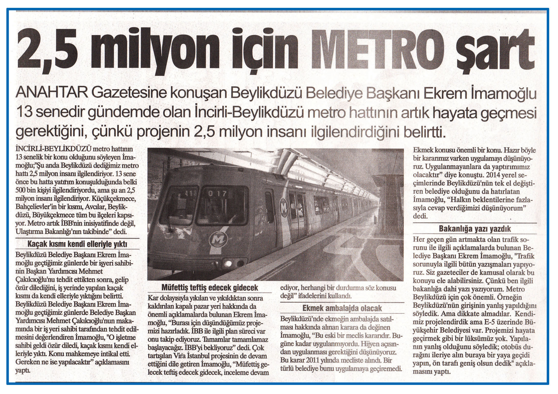 22 Nisan 2016 tarihli "ANAHTAR" gazetesi. ANAHTAR Gazetesin konuşan Beylikdüzü Belediye Başkanı Ekrem İmamoğlu 13 senedir gündemde olan İncirli-Beylikdüzü metro hattının artık hayata geçmesi gerektiğini, çünkü projenin 2,5 milyon insanı ilgilendirdiğini belirtti.