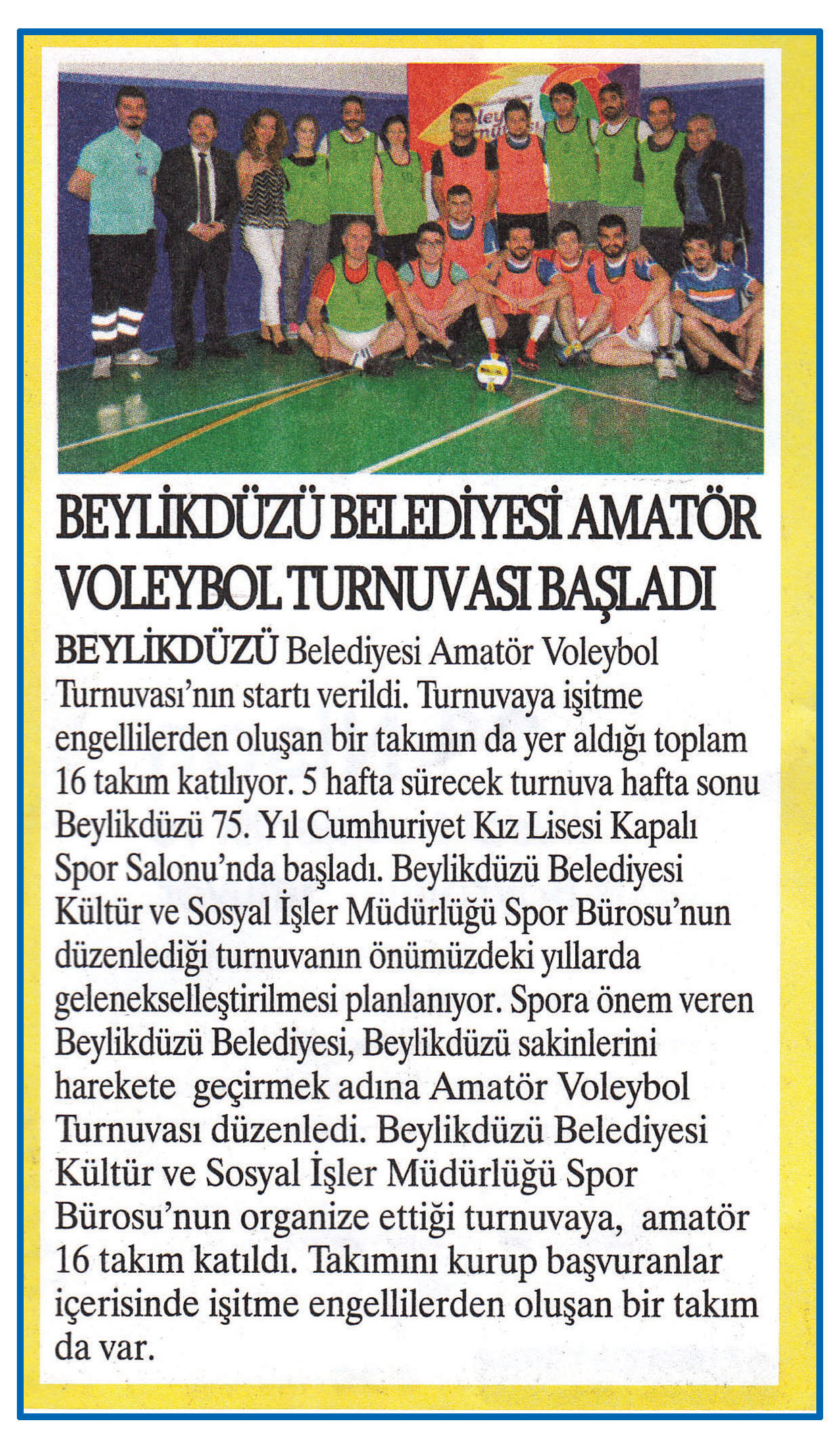 22 Nisan 2016 taihli "ZEYNA" gazetesi. Beylikdüzü Belediyesi Amatör Voleybol Turnuvası'nın startı verildi. Turnuva işitme engellilerden oluşan bir takımın da yer aldığı toplam 16 takım katılıyor. 5 hafta sürecek turnuva hafta sonu Beylikdüzü 75. Yıl Cumhuriyet Kız Lisesi Kapalı Spor Salonu'nda başladı.