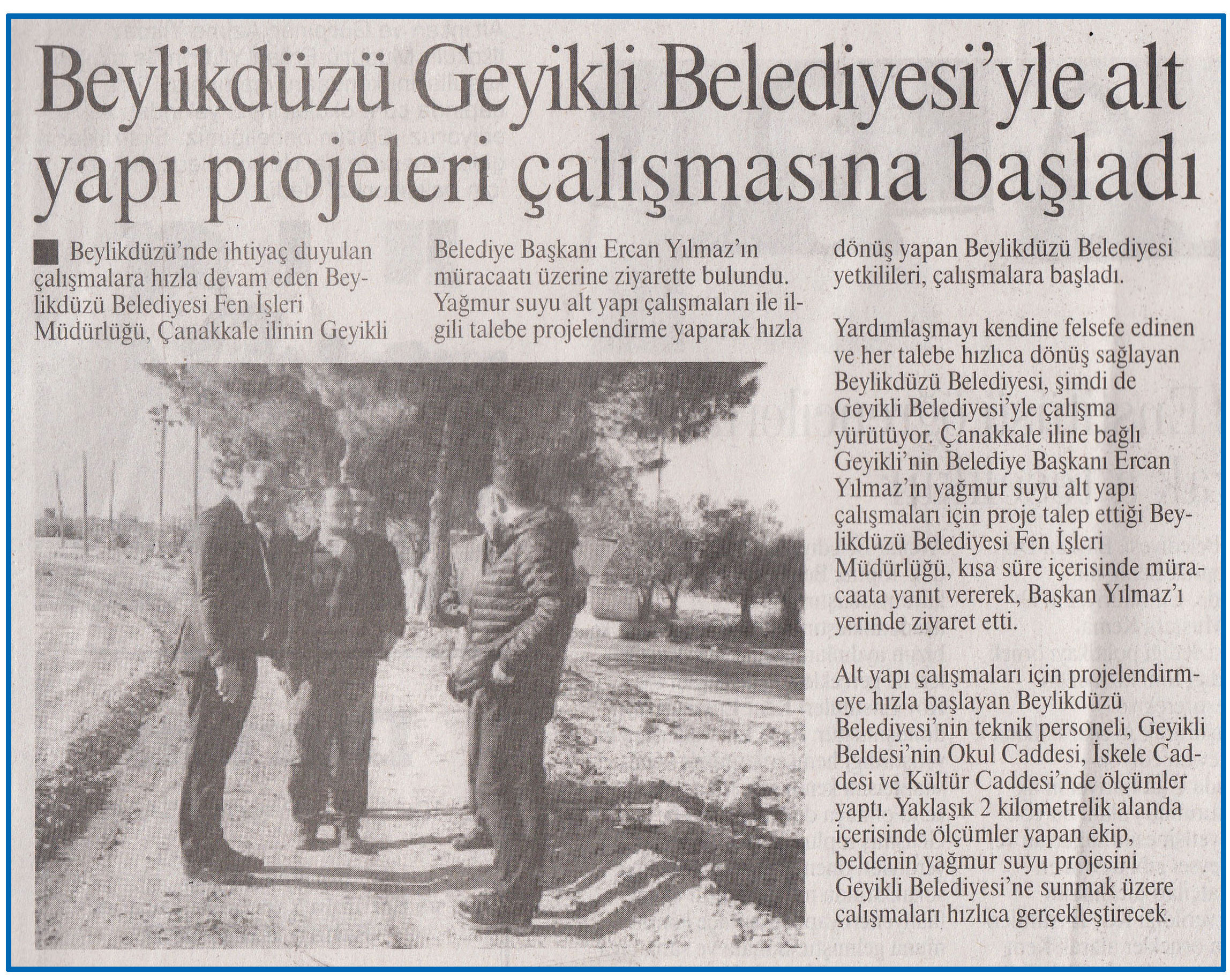 10 Kasım 2016 tarihli ''DURUM'' gazetesi. Beylikdüzü'nde ihtiyaç duyulan çalışmalara hızla devam eden Beylikdüzü Belediyesi Fen İşleri Müdürlüğü,Çanakkale İlinin Geyikli Belediye Başkanı Ercan Yılmaz'ın müracaatı üzerine ziyarette bulundu.Yağmur suyu alt yapı çalışmaları ile ilgili talebe projelendirme yaparak hızla dönüş yapan Beylikdüzü Belediyesi yetkilileri,çalışmalara başladı.