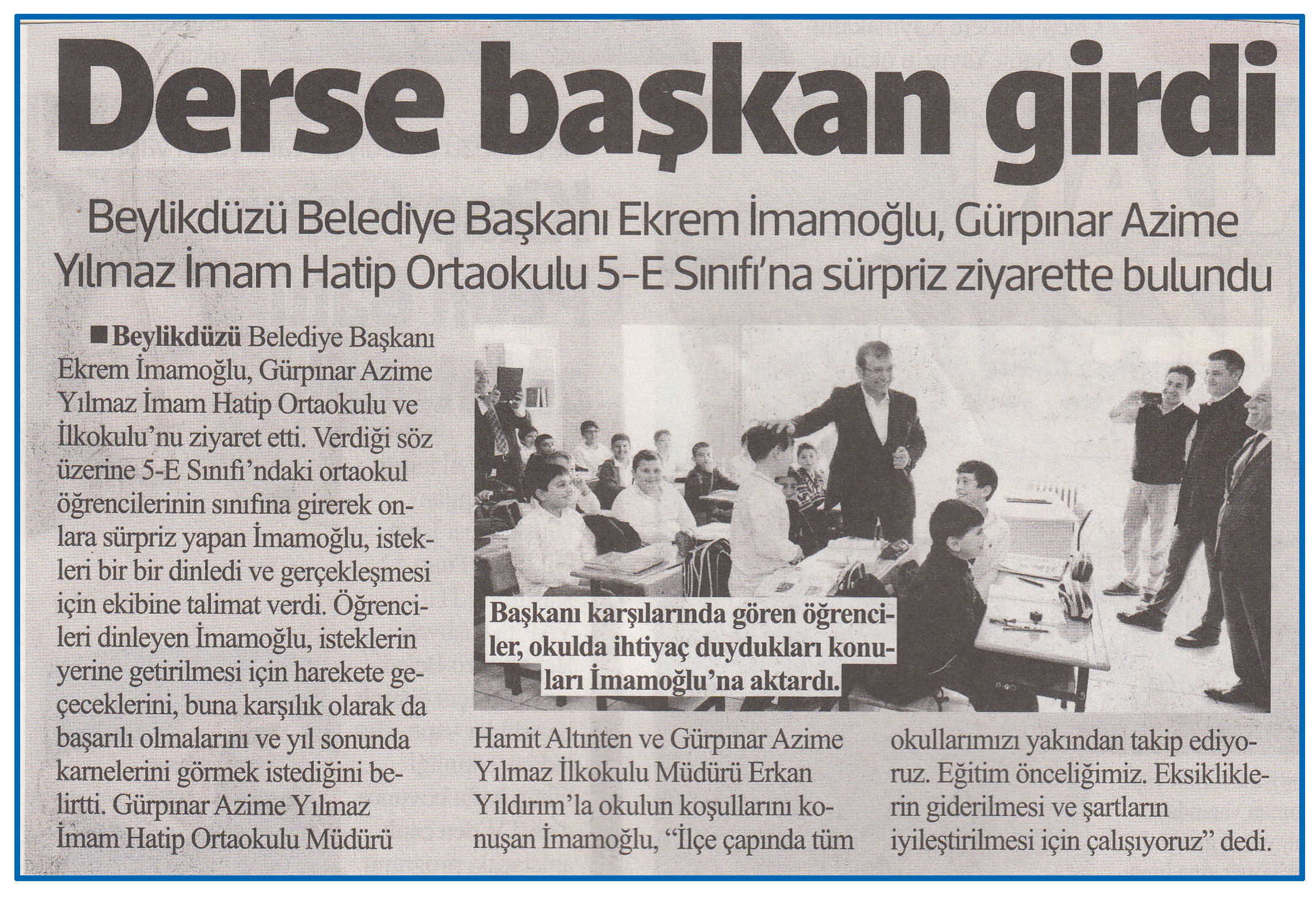 10 Kasım 2016 tarihli ''HABER EKSPRESS' gazetesi. Beylikdüzü Belediye Başkanı Ekrem İmamoğlu,Gürpınar Azime Yılmaz İmam Hatip Ortaokulu 5-E Sınıfı'na süpriz ziyarette bulundu.