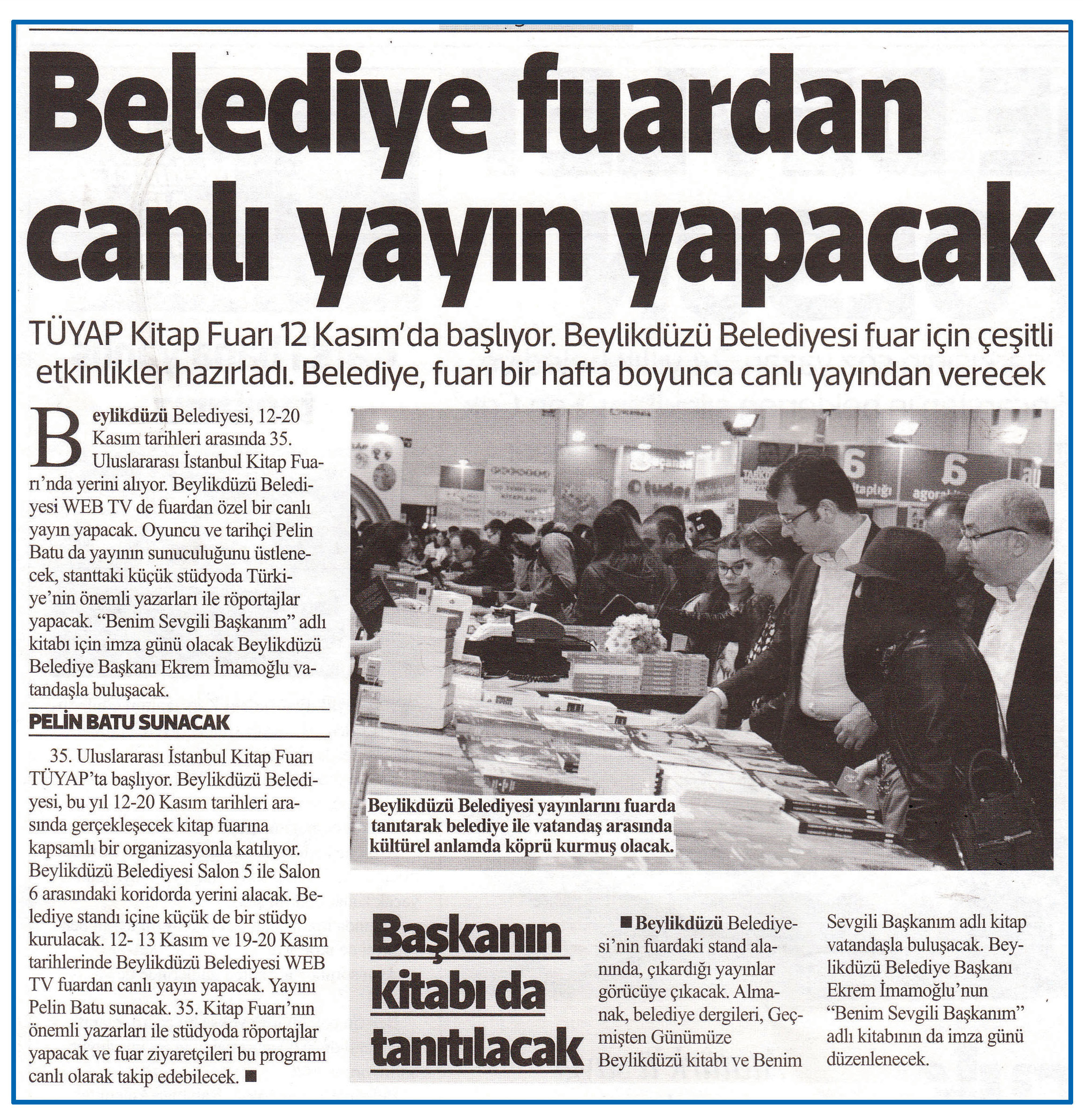 10 Kasım 2016 tarihli ''HABER EKSPRESS'' gazetesi. TÜYAP Kitap Fuarı 12 Kasım'da başlıyor.Beylikdüzü Belediyesi fuar için çeşitli etkinlikler hazırladı.Belediye,fuarı bir hafta boyunca canlı yayından verilecek.