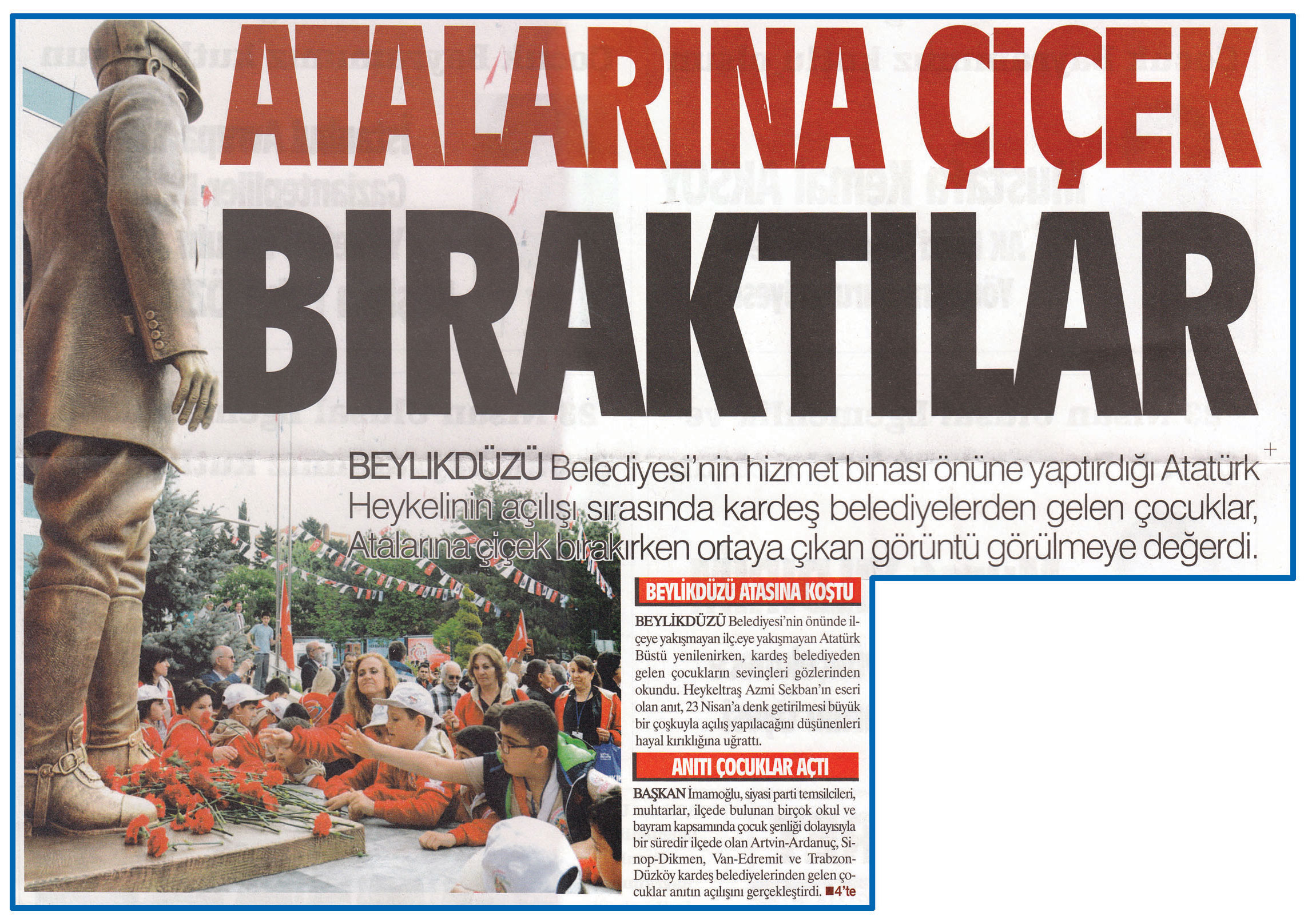 25 Nisan 2016 tarihli "HABER EKSPRESS" gazetesi. Beylikdüzü Belediyesi'nin hizmet binası önüne yaptırdığı Atatürk Heykelinin açılışı sırasında kardeş belediyelerden gelen çocuklar, Atalarına çiçek bırakırken ortaya çıkan görüntü görülmeye değerdi.