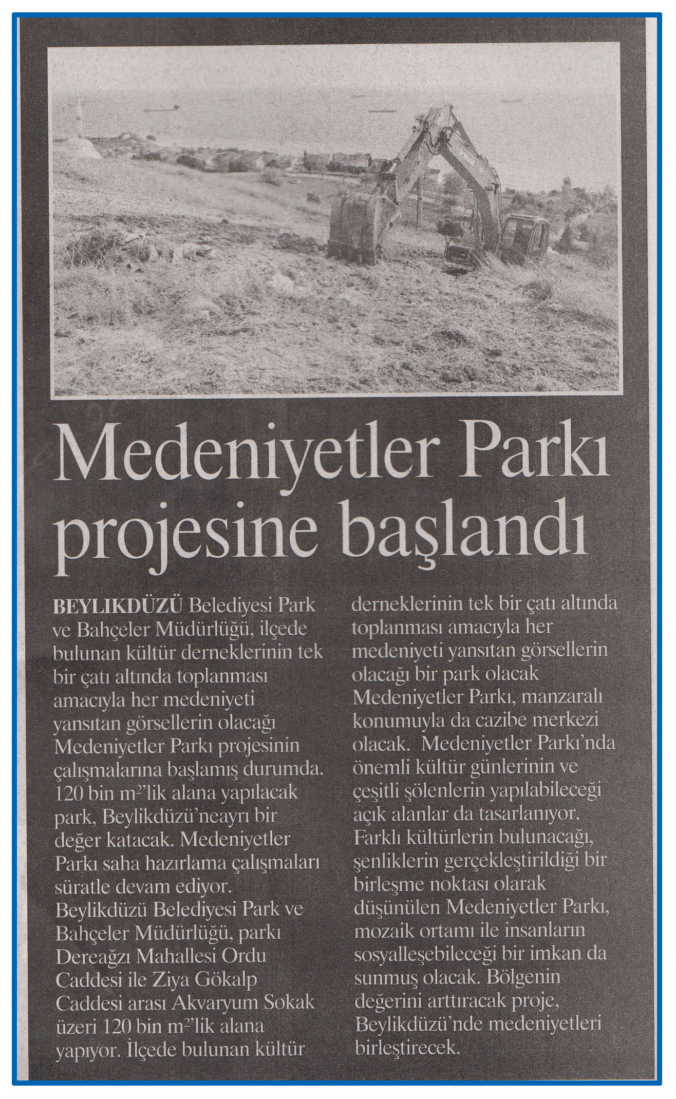10 Kasım 2016 tarihli ''KENT HABER'' gazetesi. Beylikdüzü Belediyesi Park ve Bahçeler Müdürlüğü,İlçede bulunan kültür derneklerinin tek bir çatı altında toplanması amacıyla her medeniyeti yansıtan görsellerin olacağı Medeniyetle Parkı Projesinin çalışmalarına başlamış durumda.