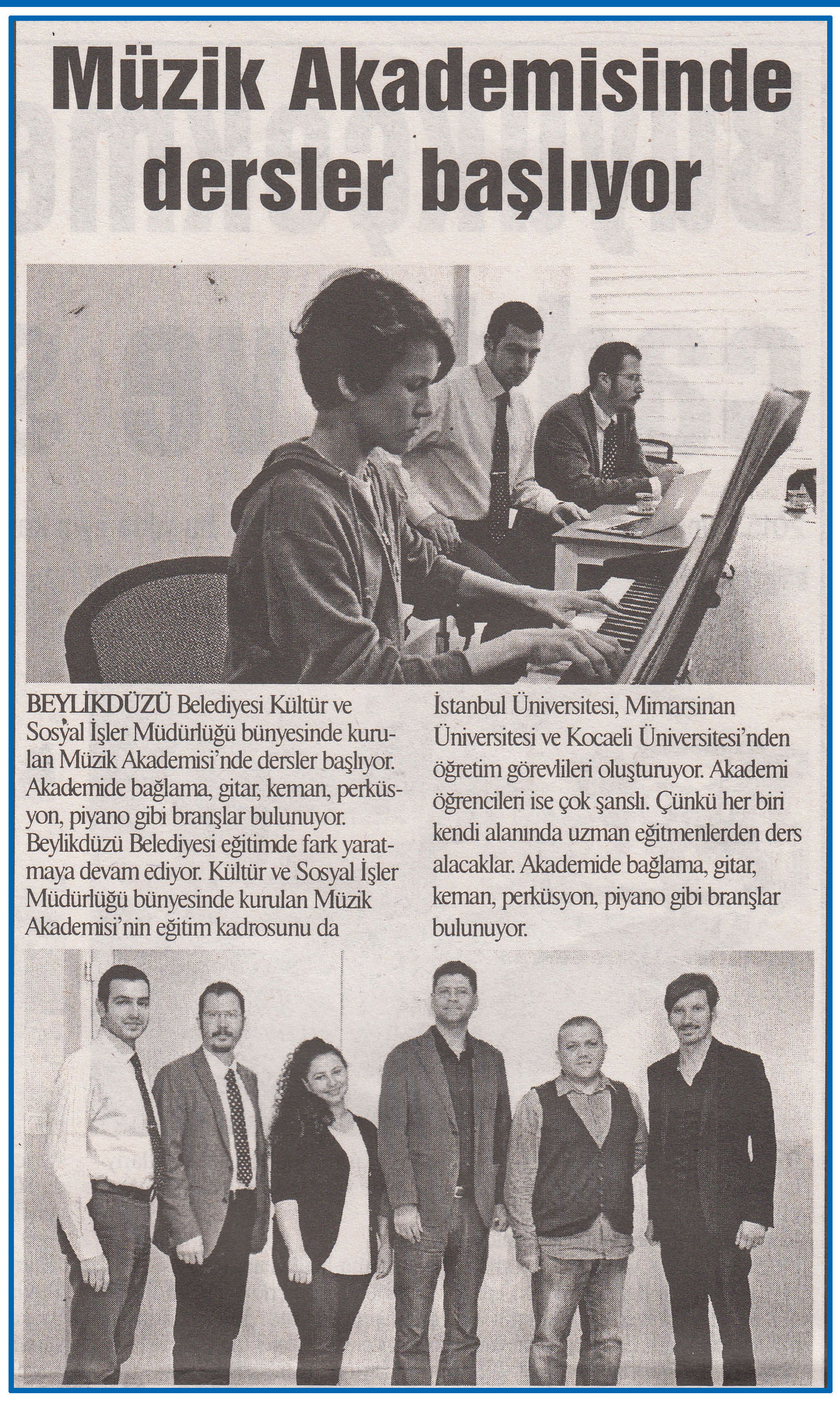 12 Ekim 2016 tarihli " MARMARA" gazetesi, Beylikdüzü Belediyesi eğitimde fark yaratmaya devam ediyor. Beylikdüzü Belediyesi Kültür ve Sosyal İşler Müdürlüğü bünyesinde kurulan Müzik Akademisi'nde dersler başlıyor.