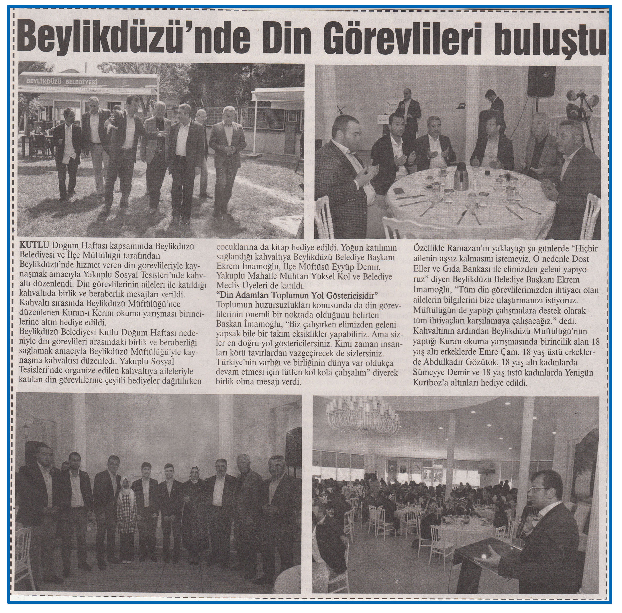 26 Nisan 2016 tarihli "MARMARA" gazetesi. Kutlu Doğum Haftası kapsamında Beylikdüzü Belediyesi ve İlçe Müftülüğü tarafından Beylikdüzü'nde hizmet veren din görevlileriyle kaynaşmak amacıyla Yakuplu Sosyal Tesisleri'nde kahvaltı düzenlendi.