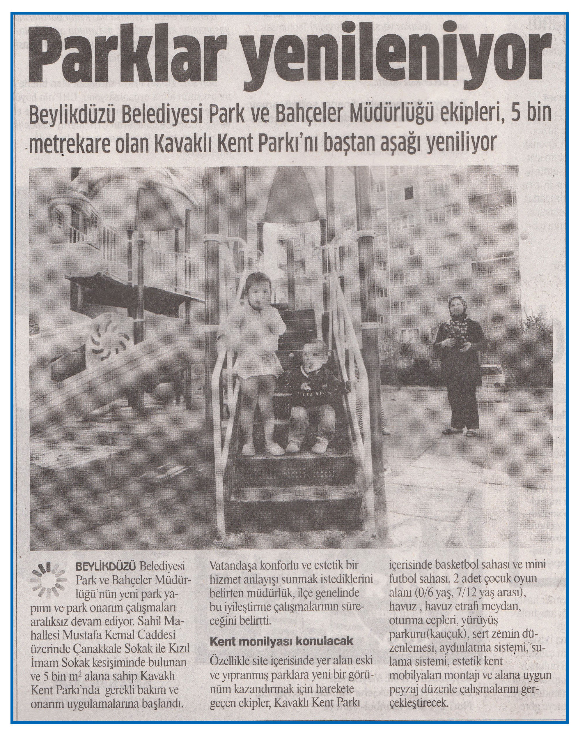 13 Ekim 2016 tarihli "GAZETEM İSTANBUL" gazetesi. Beylikdüzü Belediyesi Park ve Bahçeler Müdürlüğü ekipleri, 5 bin metrekare olan Kavaklı Kent Parkı'nı baştan aşağı yeniliyor. Vatandaşa konforlu ve estetik bir hizmet anlayışı sunmak istediklerini belirten müdürlük, ilçe genelinde bu iyileştirme çalışmalarının süreceğini belirtti.