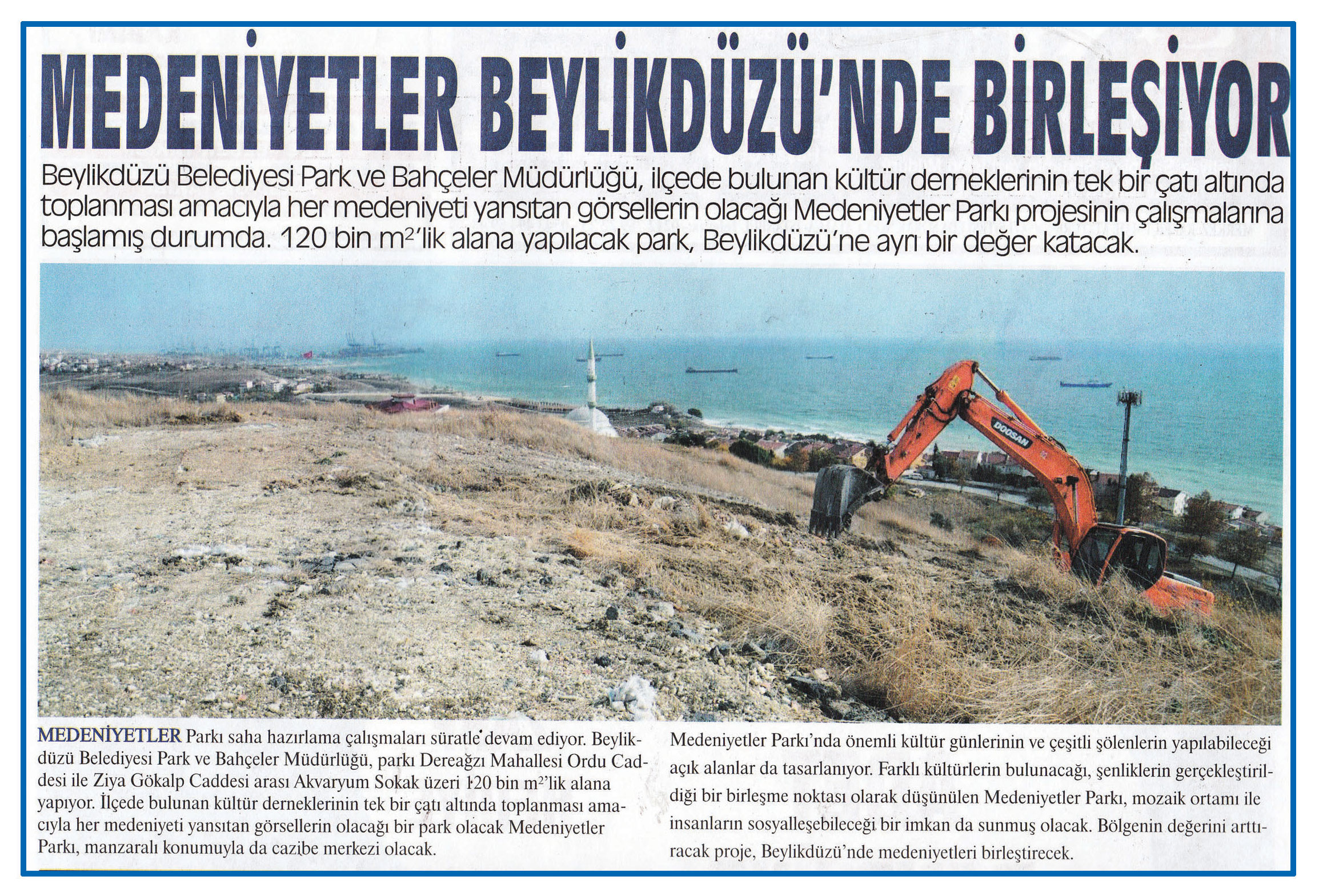 14 Kasım 2016 tarihli ''GAZETE 3. BÖLGE'' gazetesi. Beylikdüzü Belediyesi Park ve Bahçeler Müdürlüğü,ilçede bulunan kültür derneklerinin tek bir çatı altında toplanması amacıyla her medeniyeti yansıtan görsellerin olacağı Medeniyetler Parkı Projesinin çalışmalarına başlamış durumda.120 bin m²'lik alana yapılacak park,Beylikdüzü'ne ayrı bir değer katacak.