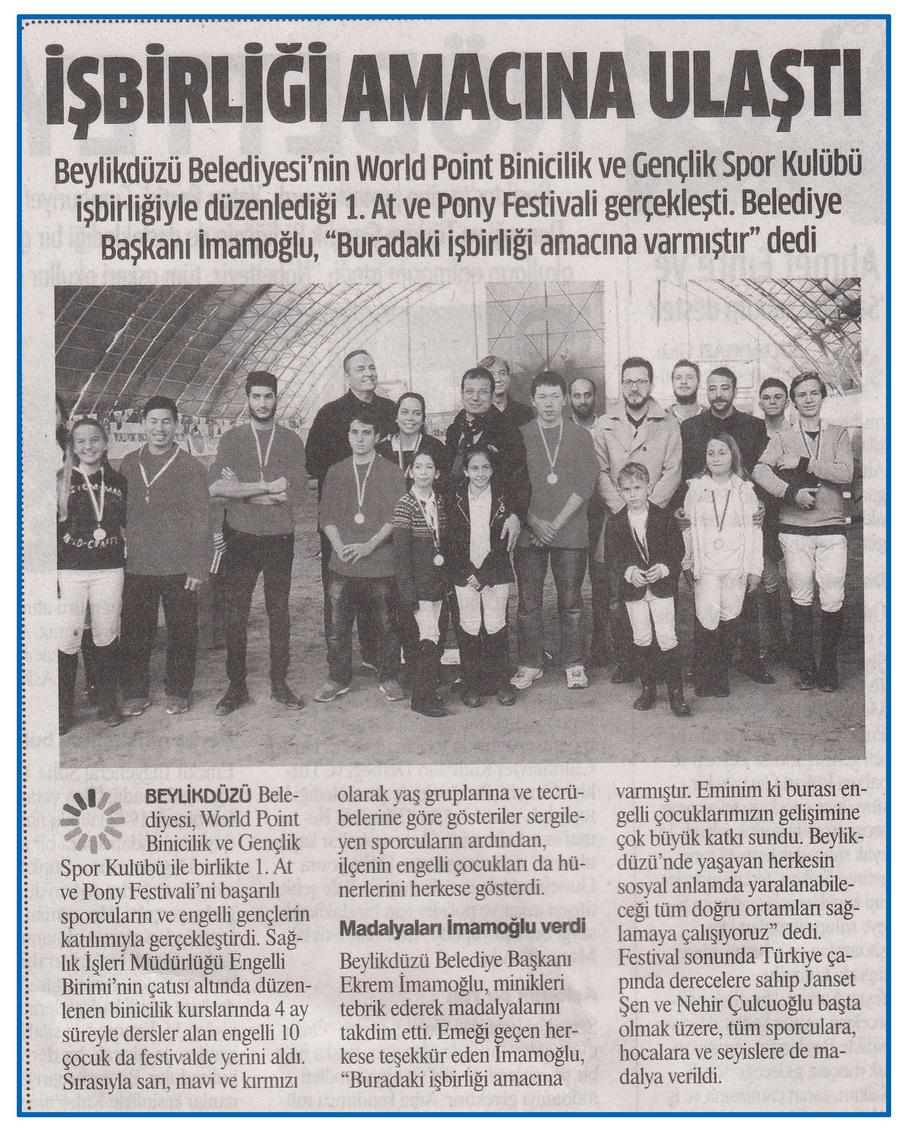 14 Kasım 2016 tarihli ''GAZETEM İSTANBUL'' gazetesi. Beylikdüzü Belediyesi'nin World Point Binicilik ve Gençlik Spor Kulubü işbirliğiyle düzenlediği 1.At ve Pony Festivali gerçekleşti.Belediye Başkanı İmamoğlu ,'' Buradaki işbirliği amacına ulaşmıştır'' dedi.