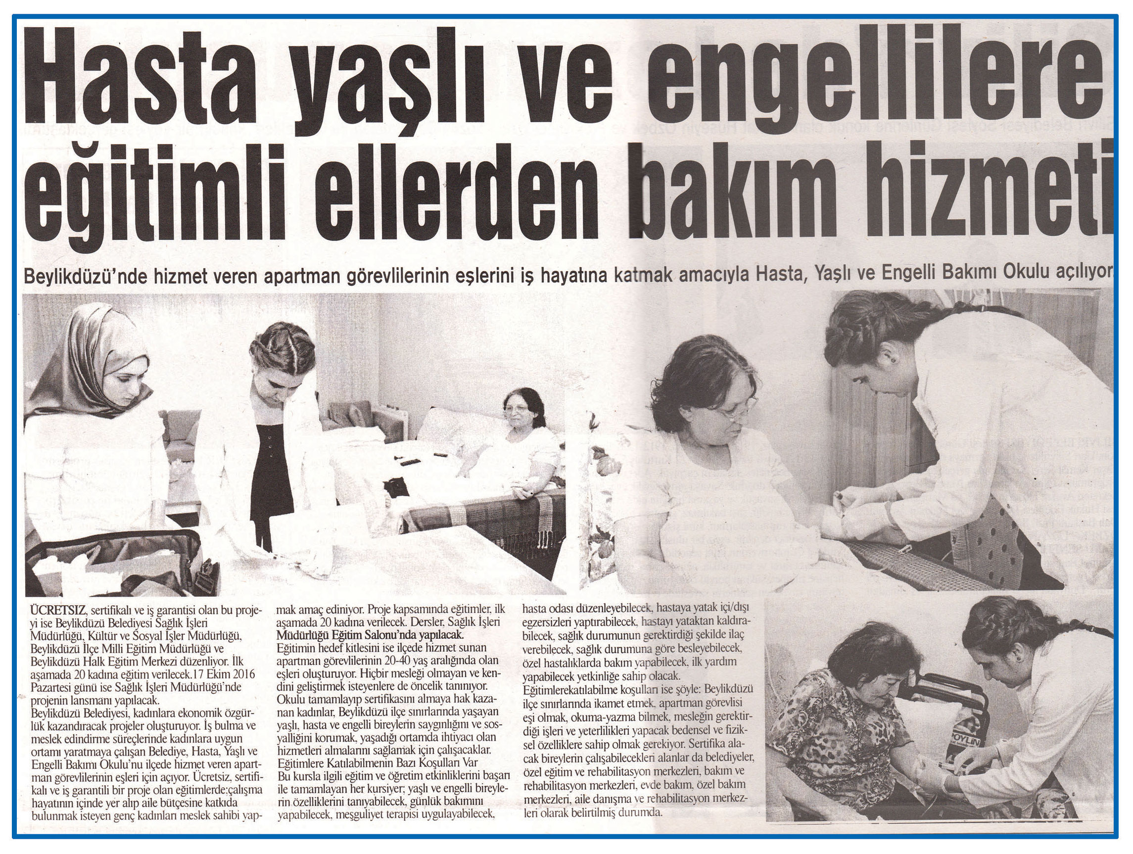 17 Ekim 2016 tarihli "MARMARA" gazetesi. Beylikdüzü'nde hizmet veren apartman görevlilerinin eşlerini iş hayatına katmak amacıyla Hasta, Yaşlı ve Engelli Bakım Okulu Açılıyor. Ücretsiz sertifikalı ve iş garantisi olan bu projeyi ise Beylikdüzü Belediyesi Sağlık İşleri Müdürlüğü, Kültür ve Sosyal İşler Müdürlüğü, Beylikdüzü İlçe Milli Eğitim Müdürlüğü ve Beylikdüzü Halk Eğitim Merkezi düzenliyor. İlk aşamada 20 kadına eğitim verilecek.