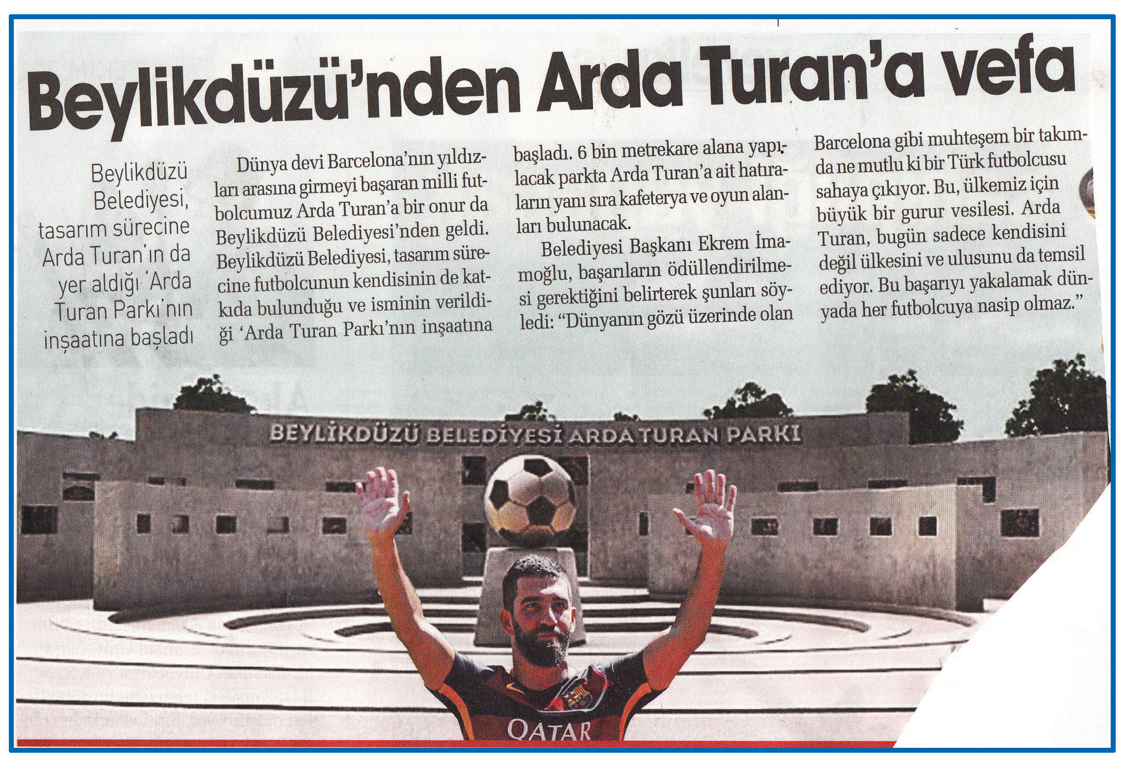 17 Ekim 2016 tarihli "YEREL KULİS" gazetesi. Beylikdüzü Belediyesi, tasarım sürecine Arda Turan'ın da yer aldığı Arda Turan Parkı'nın inşaatına başladı. 6 bin metrekare alana yapılacak parkta Arda Turan'a ait hatıralarının yanı sıra kafeterya ve oyun alanları bulunacak.