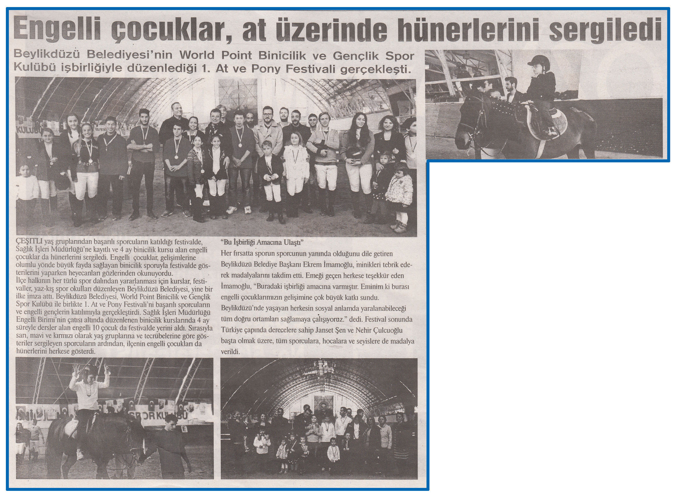 15 Kasım 2016 tarihli ''MARMARA'' gazetesi. Beylikdüzü Belediyesi'nin World Point Binicilik ve Gençlik Spor Kulubü işbirliğiyle düzenlediği 1.At ve Pony Festivali gerçekleşti.