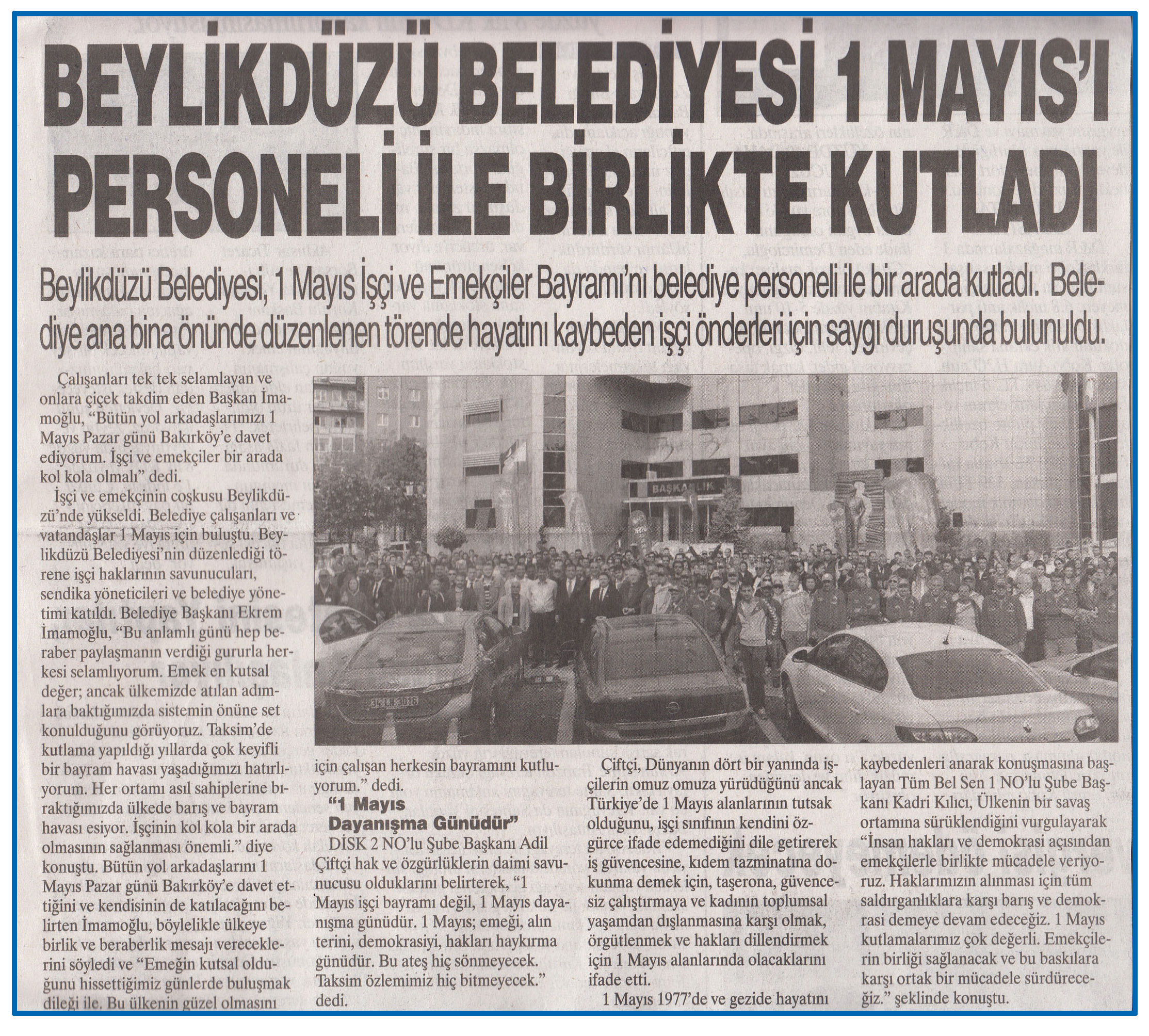 2 Mayıs 2016 tarihli "BÜYÜKÇEKMECE" gazetesi. Beylikdüzü Belediyesi, 1 Mayıs İşçi ve Emekçiler Bayramı'nı belediye personeli ile bir arada kutladı. Belediye ana bina önünde düzenlenen törende hayatını kaybeden işçi önderleri için saygı duruşunda bulunuldu.