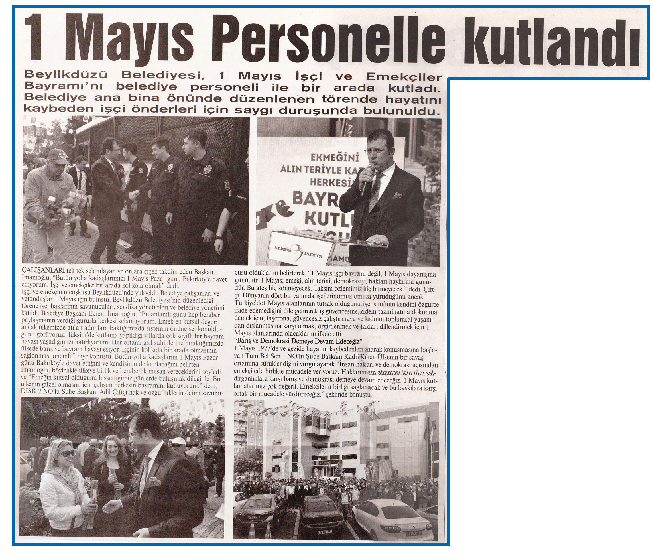 2 Mayıs 2016 tarihli "MARMARA" gazetesi. Beylikdüzü Belediyesi, 1 Mayıs İşçi ve Emekçiler Bayramı'nı belediye personeli ile bir arada kutladı. Belediye ana bina önünde düzenlenen törende hayatını kaybeden işçi önderleri için saygı duruşunda bulunuldu.