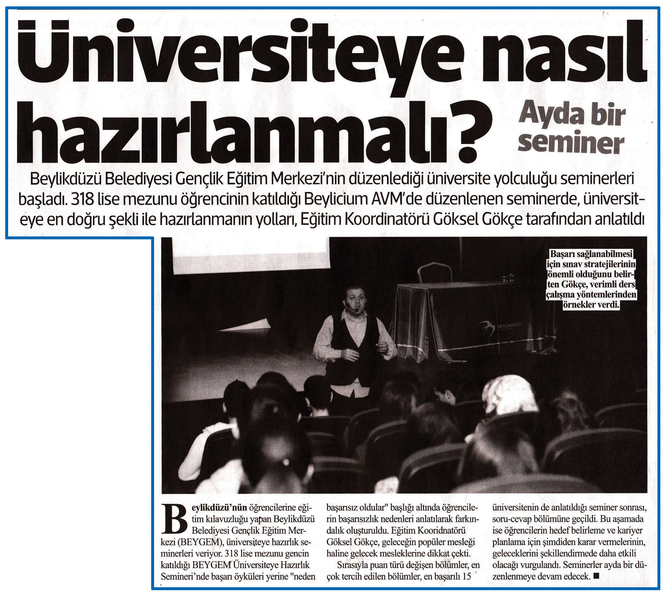 17 Kasım 2016 tarihli ''HABER EKPRESS'' Beylikdüzü Belediyesi Gençlik Eğitim Merkezi'nin düzenlediği üniversite yolculuğu seminerleri başladı. 318 lise mezunu öğrencinin katıldığı Beylicium AVM'de düzenlenen seminerde,üniversiteye en doğru şekli ile hazırlanmanın yolları,Eğitim Koordinatörü Göksel Görçe tarafından anlatıldı.