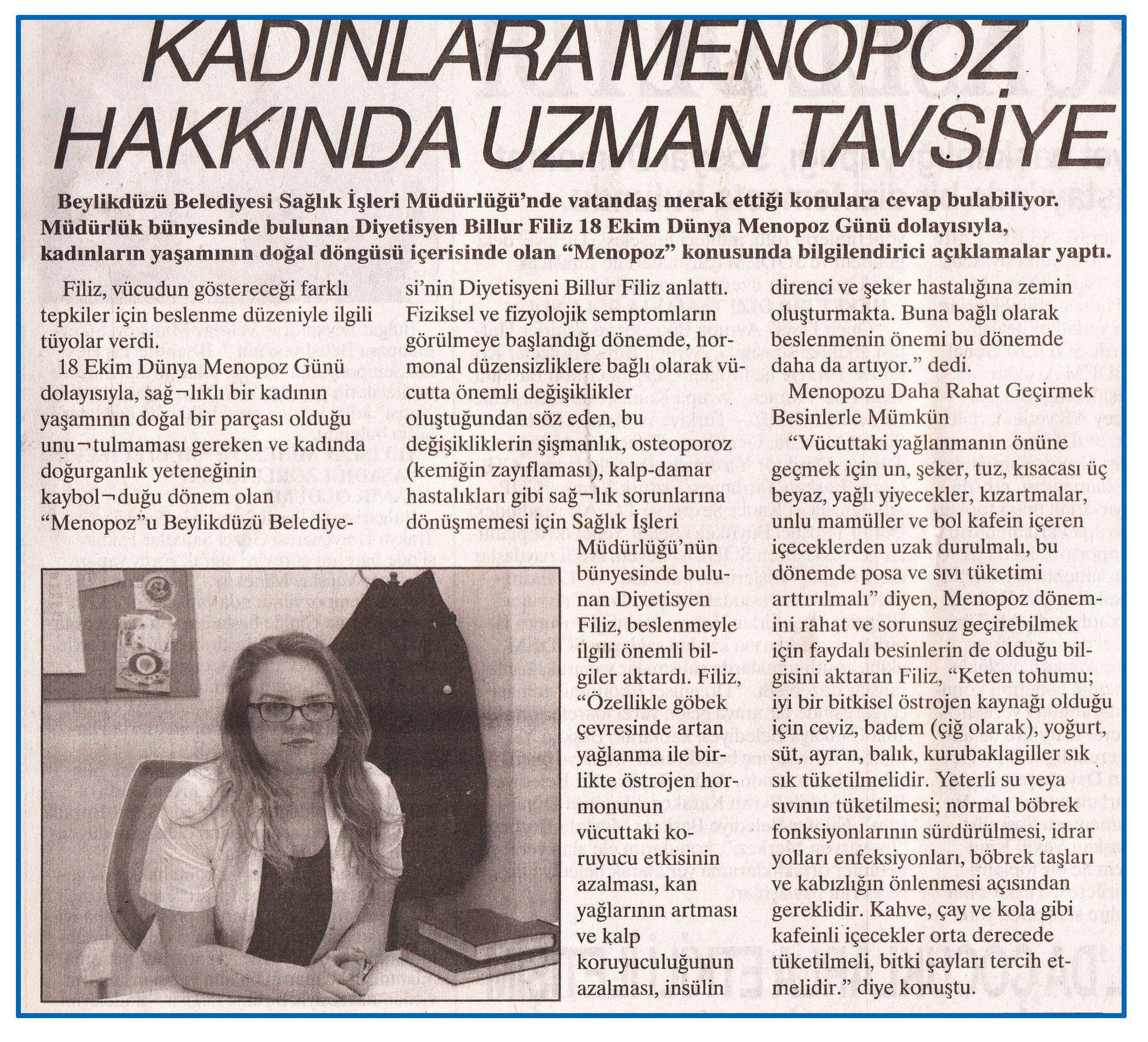20 Ekim 2016 tarihli "YURT HABER" gazetesi. Beylikdüzü Belediyesi Sağlık İşleri Müdürlüğü'nde vatandaş merak ettiği konulara cevap bulabiliyor. Müdürlük bünyesinde bulunan Diyetisyen Billur Filiz 18 Ekim Dünya Menopoz Günü dolayısıyla, kadınlara yaşamın doğal döngüsü içerisinde olan "Menopoz" konusunda bilgilendirici açıklamalar yaptı.