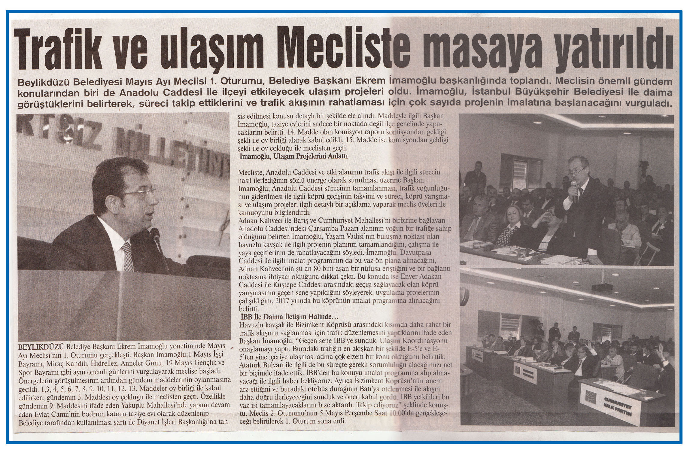 3 Mayıs 2016 tarihli "MARMARA" gazetesi. Beylikdüzü Belediyesi Mayıs Ayı Meclisi 1. Oturumu, Belediye Başkanı Ekrem İmamoğlu başkanlığında toplandı. Meclisin önemli gündem konularından biri de Anadolu Caddesi ile ilçeyi etkileyecek ulaşım projeleri oldu.