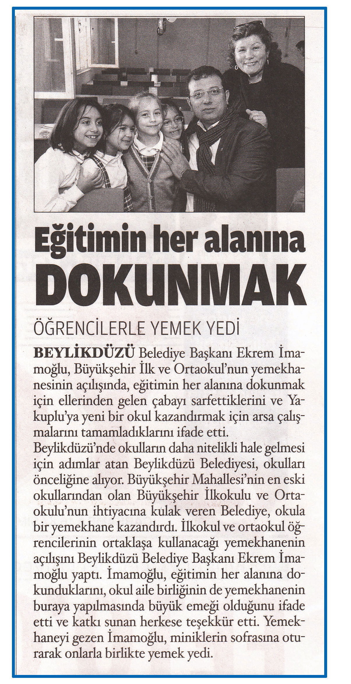 17 Kasım 2016 tarihli ''YÖREM'' gazetesi. Beylikdüzü Belediye Başkanı Ekrem İmamoğlu,Büyükşehir İlk ve Ortaokulu'nun yemekhanesinin açılışında, eğitimin her alanına dokunmak için ellerinden gelen çabayı sarfettiklerini ve Yakuplu'ya yeni bir okul kazandırmak için arsa çalışmalarını tamamladıklarını ifade etti.