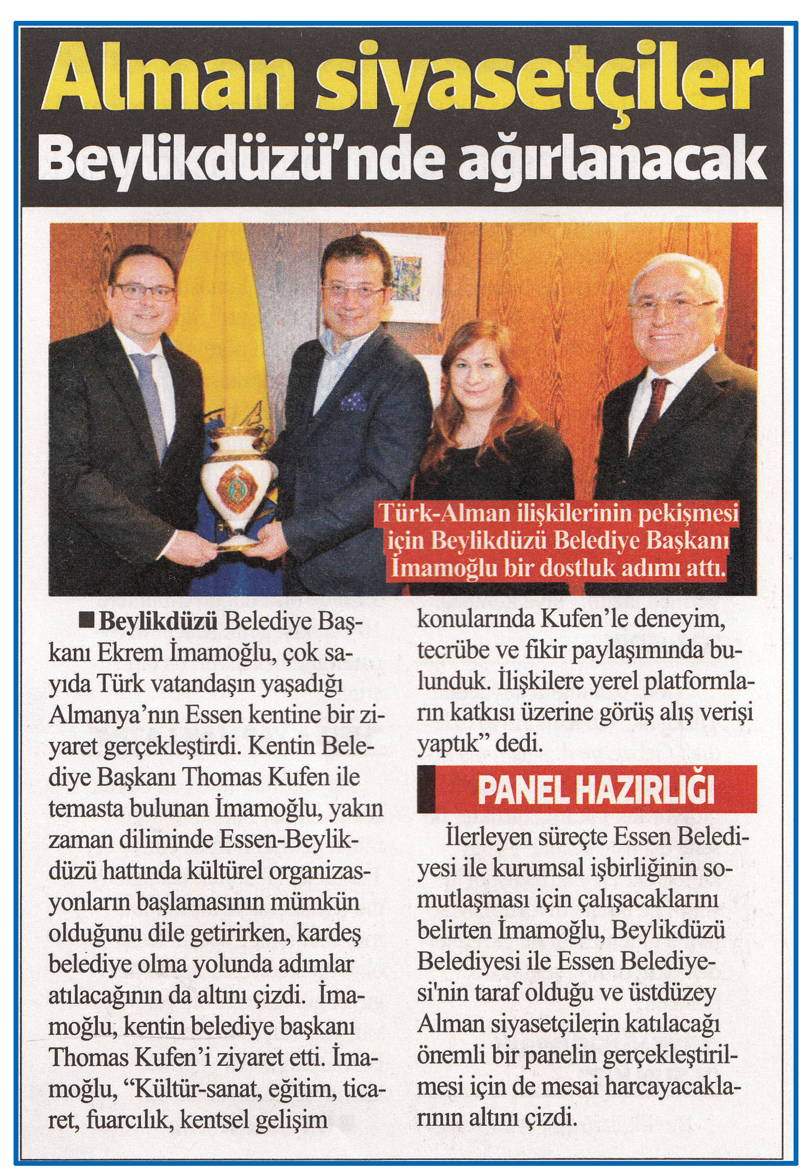 18 Kasım 2016 tarihli ''HABER EKSPRESS'' gazetesi.Türk-Alman ilişkilerinin pekişmesi için Beylikdüzü Belediye Başkanı İmamoğlu bir dostluk adımı attı.