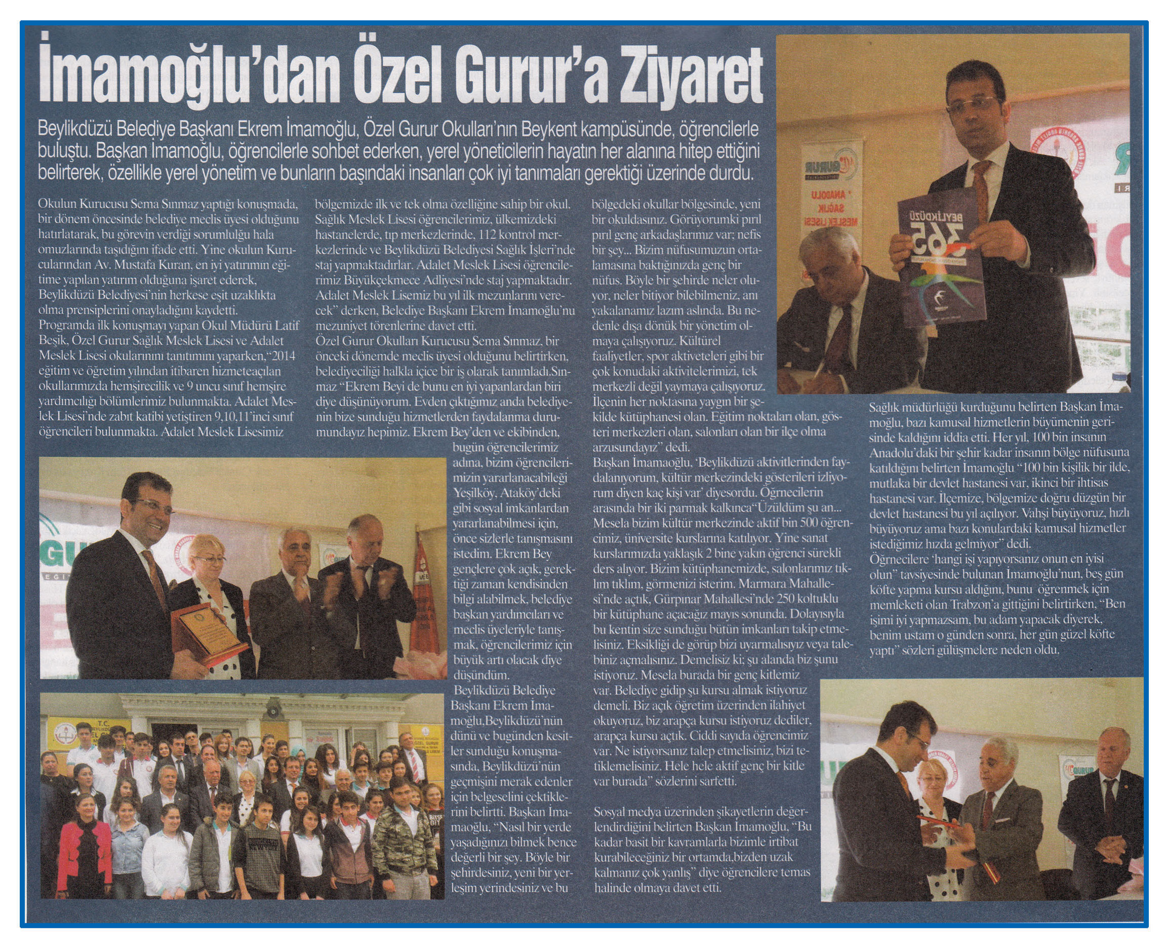 3 Mayıs 2016 tarihli "MEDYA" gazetesi. Beylikdüzü Belediye Başkanı Ekrem İmamoğlu, Özel Gurur Okulları'nın Beykent kampüsünde, öğrencilerle buluştu. Başkan İmamoğlu, öğrencilerle sohbet ederken, yerel yöneticilerin hayatın her alanına hitap ettiğini belirterek, özellikle yerel yönetim ve bunların başındaki insanları çok iyi tanımaları gerektiği üzerinde durdu.