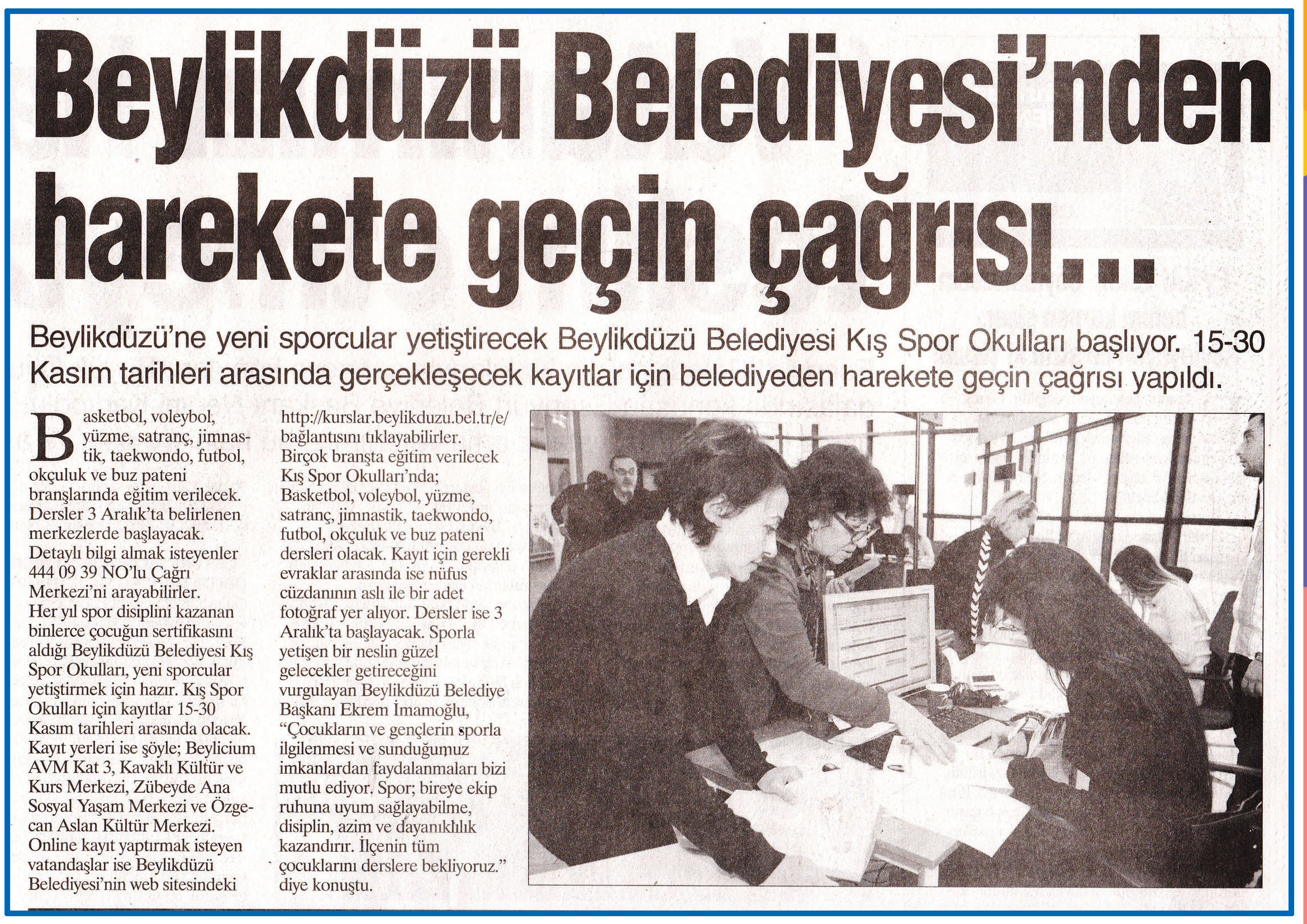 18 Kasım 2016 tarihli ''KENT HABER'' gazetesi. Beylikdüzü'ne yeni sporcular yetiştirecek Beylikdüzü Belediyesi Kış Spor Okulları başlıyor.15-30 Kasım tarihleri arasında gerçekleşecek kayıtlar için belediyeden harekete geçin çağrısı yapıldı.