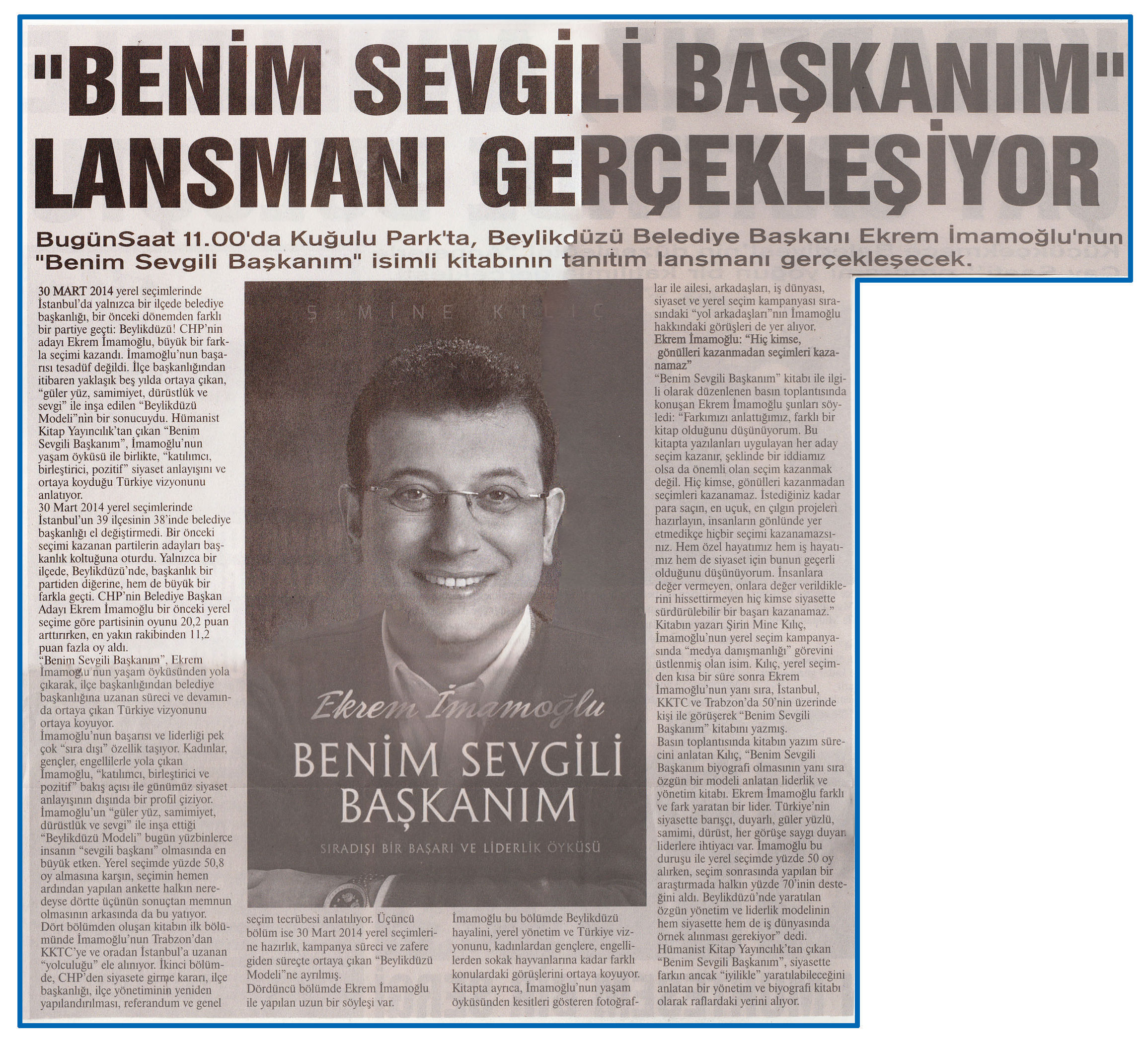 9 Mayıs 2016 tarihli "MARMARA" gazetesi. Bugün Saat 11.00'da Kuğulu Park'ta Beylikdüzü Belediye Başkanı Ekrem İmamoğlu'nun "Benim Sevgili Başkanım" isimli kitabının tanıtım lansmanı gerçekleşecek.