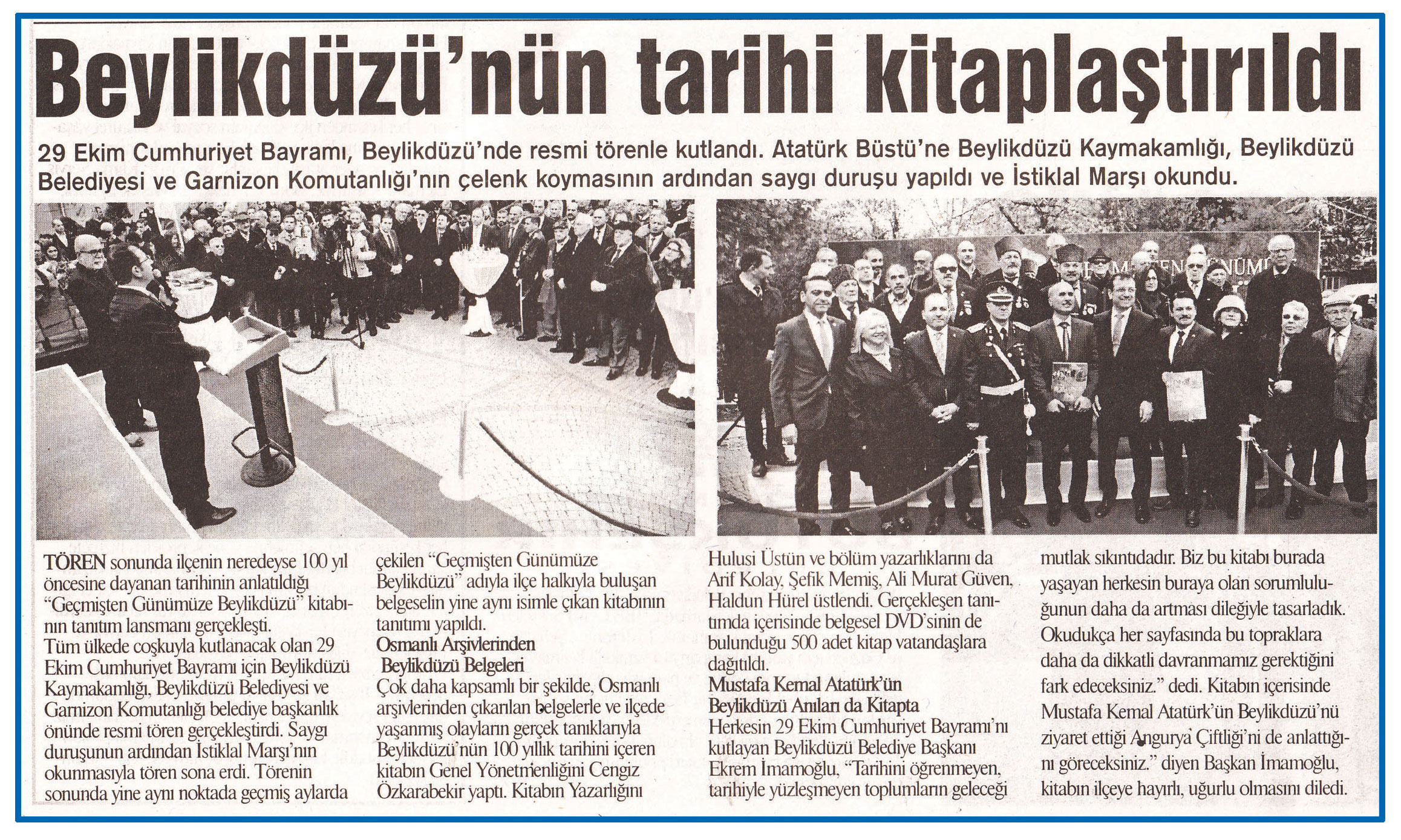 31 Ekim 2016 tarihli "MARMARA" gazetesi. 29 Ekim Cumhuriyet Bayramı, Beylikdüzü'nde resmi törenle kutlandı. Tören sonunda ilçenin neredeyse 100 yıl öncesine dayanan tarihinin anlatıldığı " Geçmişten Günümüze Beylikdüzü" kitabının tanıtım lansmanı gerçekleşti. Kitabın genel yönetmenliğini Cengiz Özkarabekir yaptı.Kitabın yazarlığını Hulusi Üstün,Arif Kolay,Şefik Memiş, ALi Murat Güven, Haldun Hürel üstlendi.