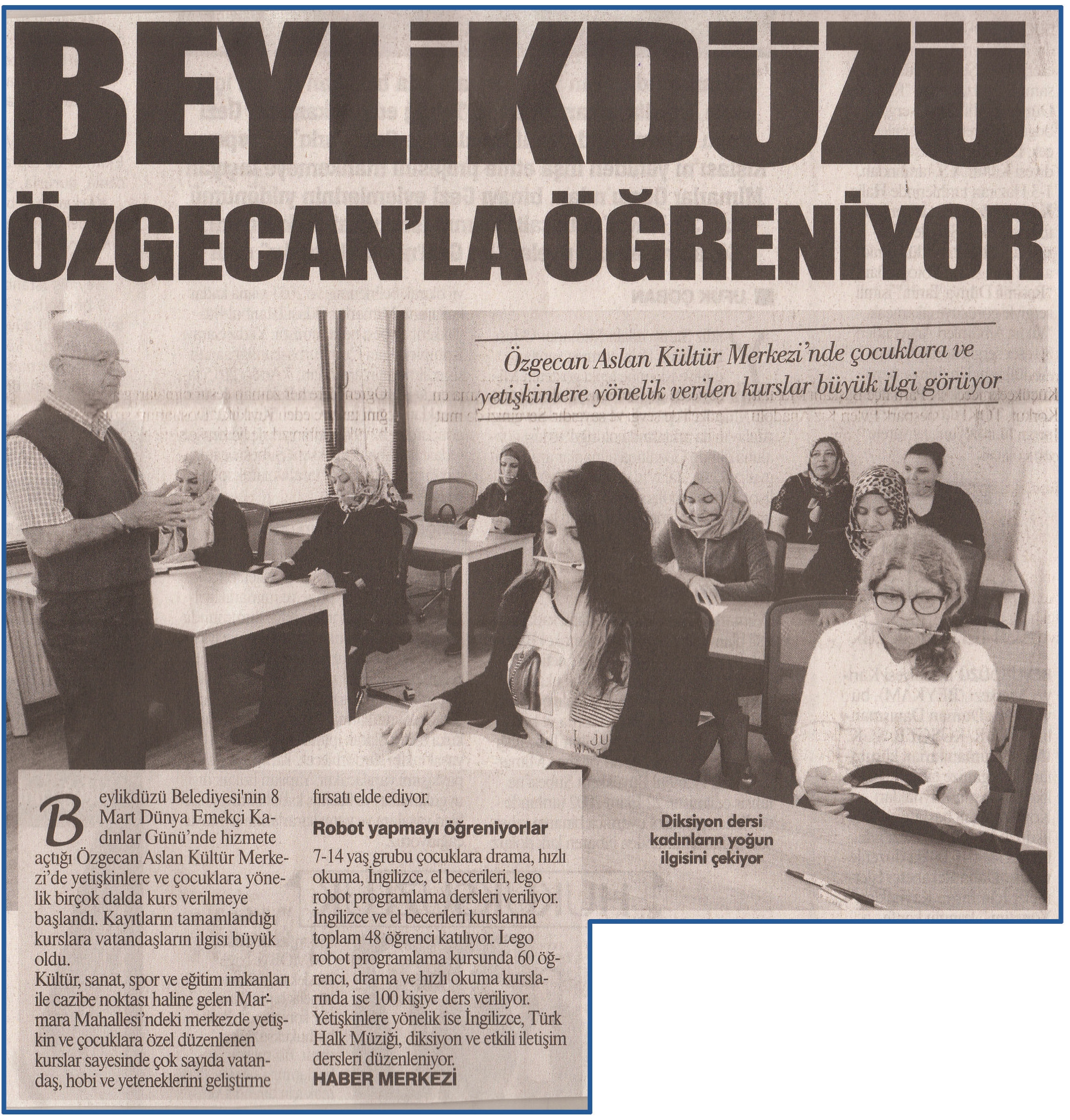 1 Haziran 2016 tarihli "GAZETEM İSTANBUL" gazetesi. Beylikdüzü Belediyesi'nin 8 Mart Dünya Emekçi Kadınlar Günü'nde hizmete açtığı Özgecan Aslan Kültür Merkezi'de yetişkinlere ve çocuklara yönelik bir çok dalda kurs verilmeye başlandı. Kayıtların tamamlandığı kurslara vatandaşların ilgisi büyük oldu.