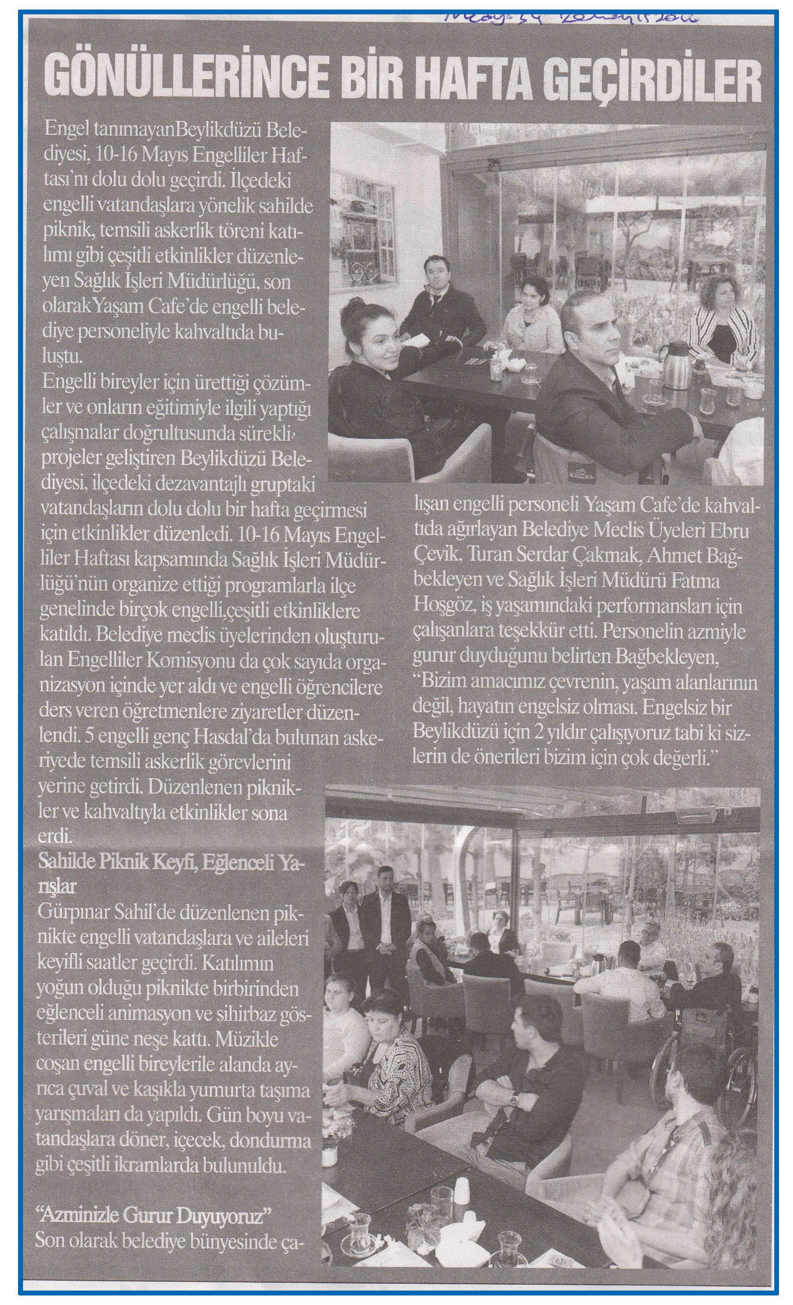 20 Mayıs 2016 tarihli "MEDYA" gazetesi. Engel tanımayan Beylikdüzü Belediyesi, 10-16 Mayıs Engelliler Haftası'nı dolu dolu geçirdi. İlçedeki engelli vatandaşlara yönelik sahilde piknik, temsili askerlik töreni katılımı gibi çeşitli etkinlikler düzenleyen Sağlık İşleri Müdürlüğü, son olarak Yaşam Cafe'de engelli belediye personeliyle kahvaltıda buluştu.