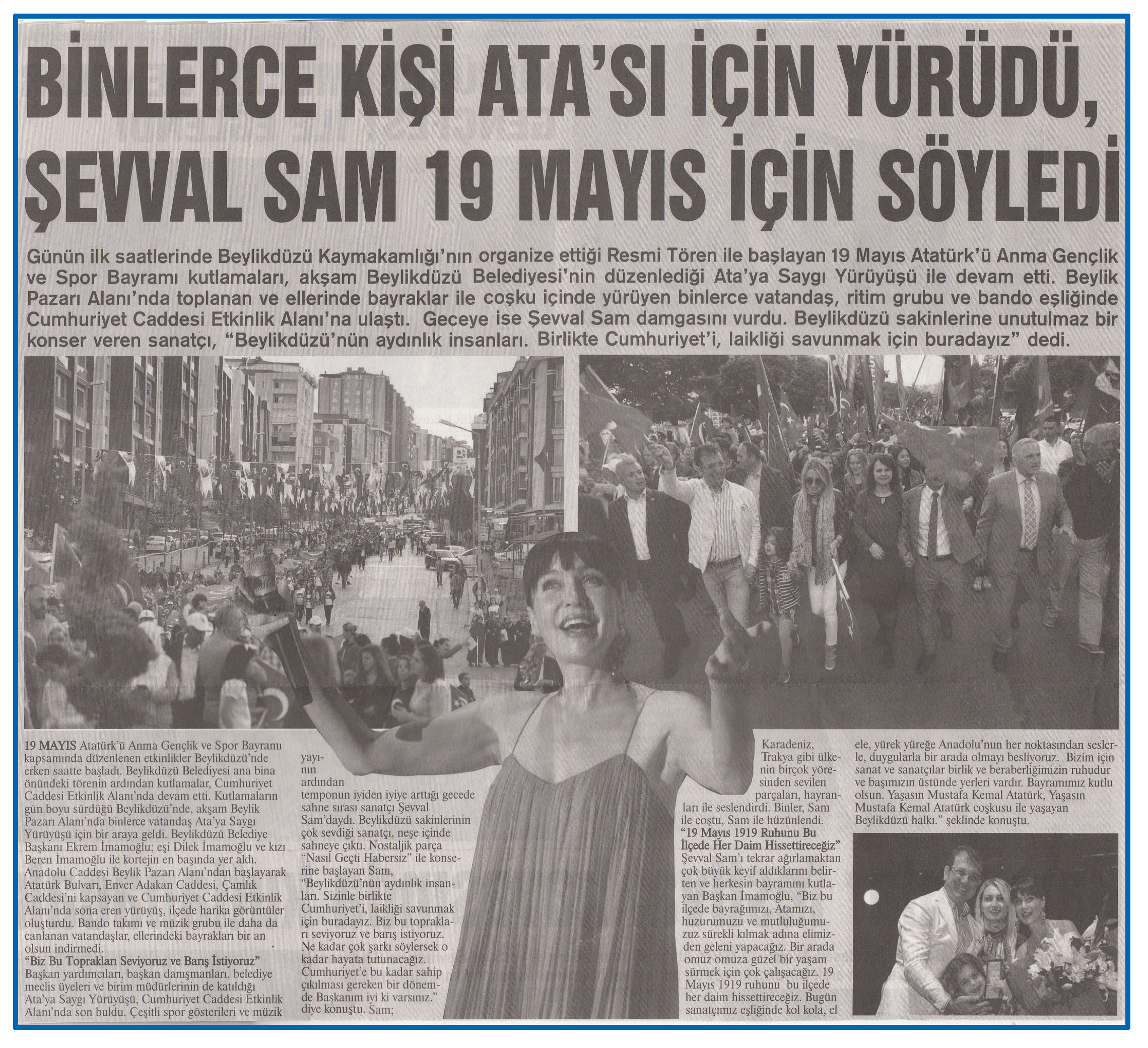 23 Mayıs 2016 tarihli "MARMARA" gazetesi. Günün ilk saatlerinde Beylikdüzü Kaymakamlığı'nın organize ettiği Resmi Tören ile başlayan 19 Mayıs Atatürk'ü Anma Gençlik ve Spor Bayramı kutlamaları, akşam Beylikdüzü Belediyesi'nin düzenlediği Ata'ya Saygı Yürüyüşü ile devam etti.