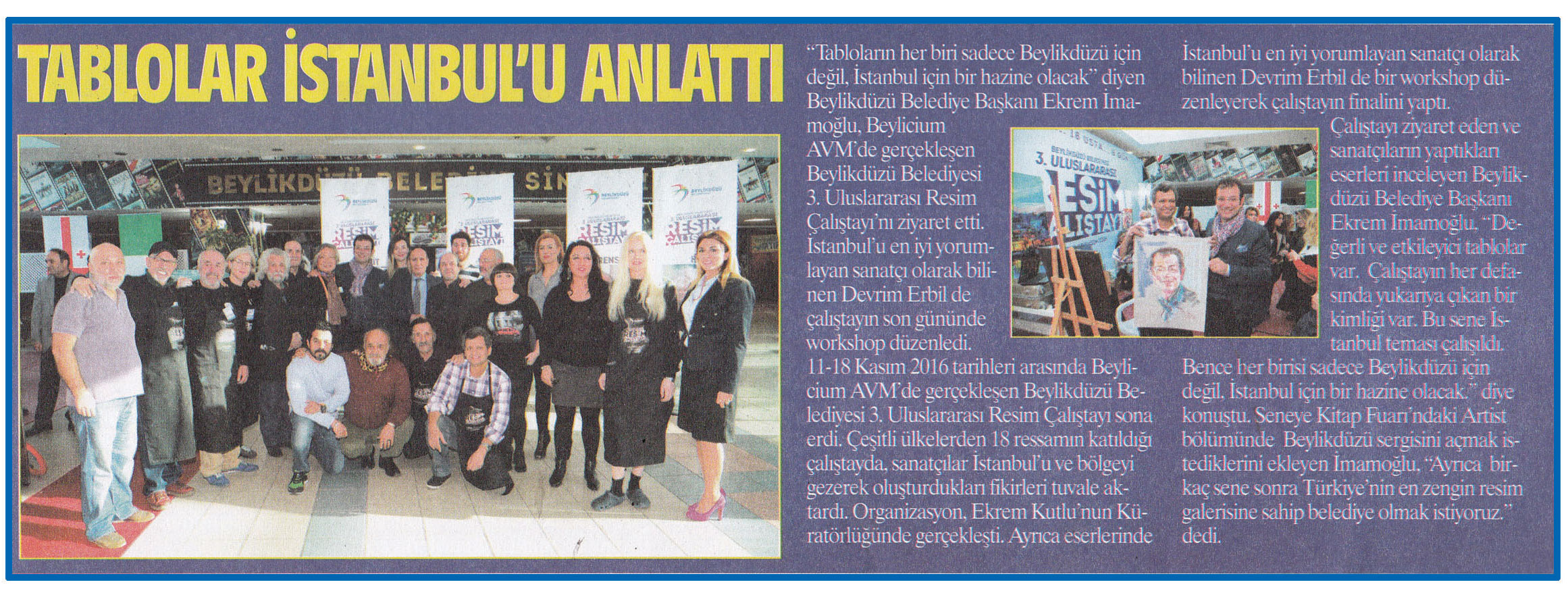 23 kasım 2016 tarihli ''ZEYNA'' gazetesi. ''Tabloların her biri sadece Beylikdüzü için değil, İstanbul için bir hazine olacak'' diyen Beylikdüzü Belediye Başkanı Ekrem İmamoğlu, Beylicium AVM de gerçekleşen Beylikdüzü Belediyesi 3. Uluslararası Resim Çalıştayı'nı ziyaret. etti.