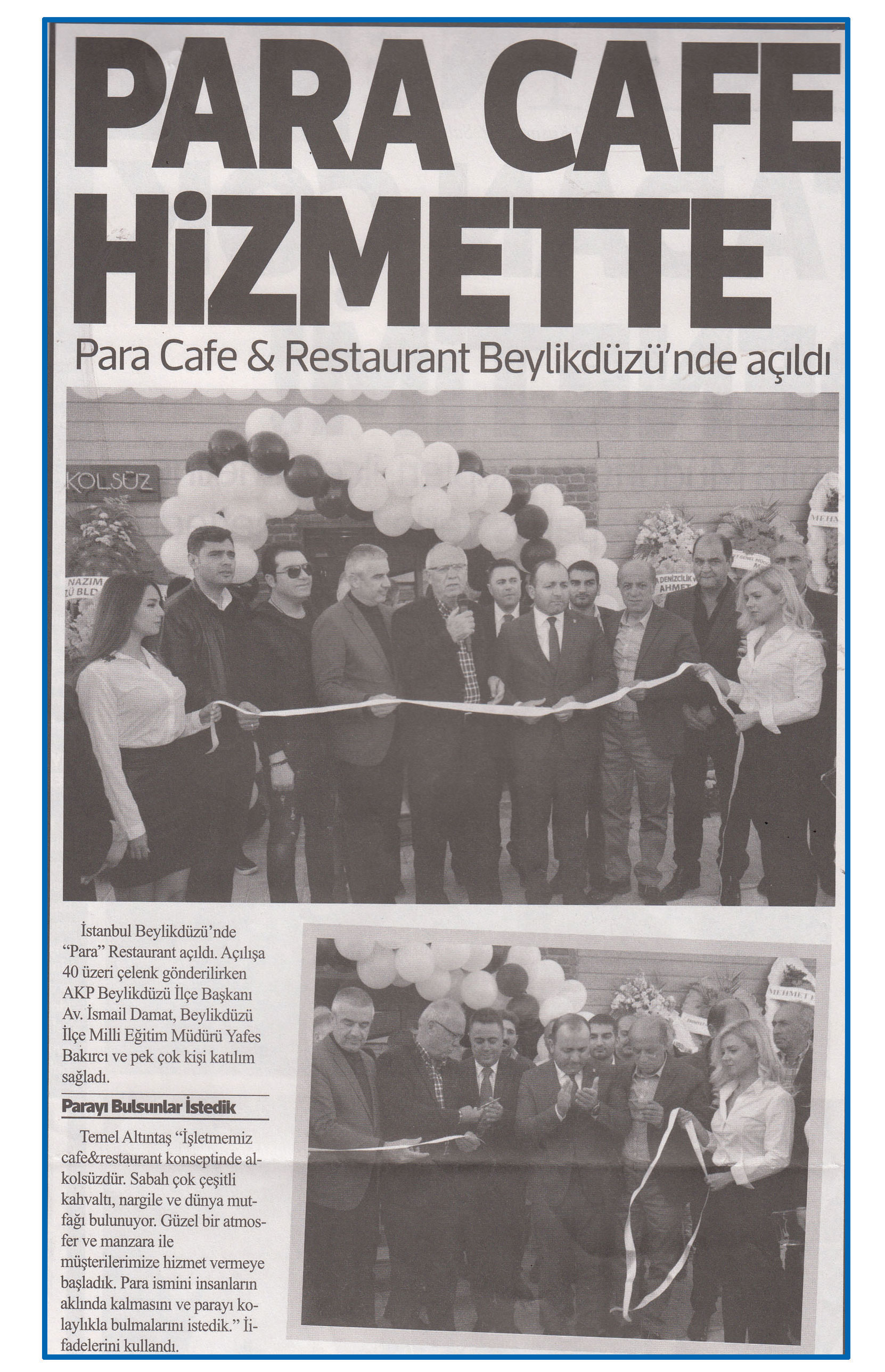 24 kasım 2016 tarihli ''TEKİN HABER'' gazetesi. İstanbul Beylikdüzü'nde ''Para'' Restaurant açıldı.Açılışa 40 üzeri çelenk gönderilirken AKP Beylikdüzü İlçe Başkanı Av. İsmail Damat Beylikdüzü İlçe Milli Eğitim Müdürü Yafes Bakırcı ve birçok kişi katılım sağladı.