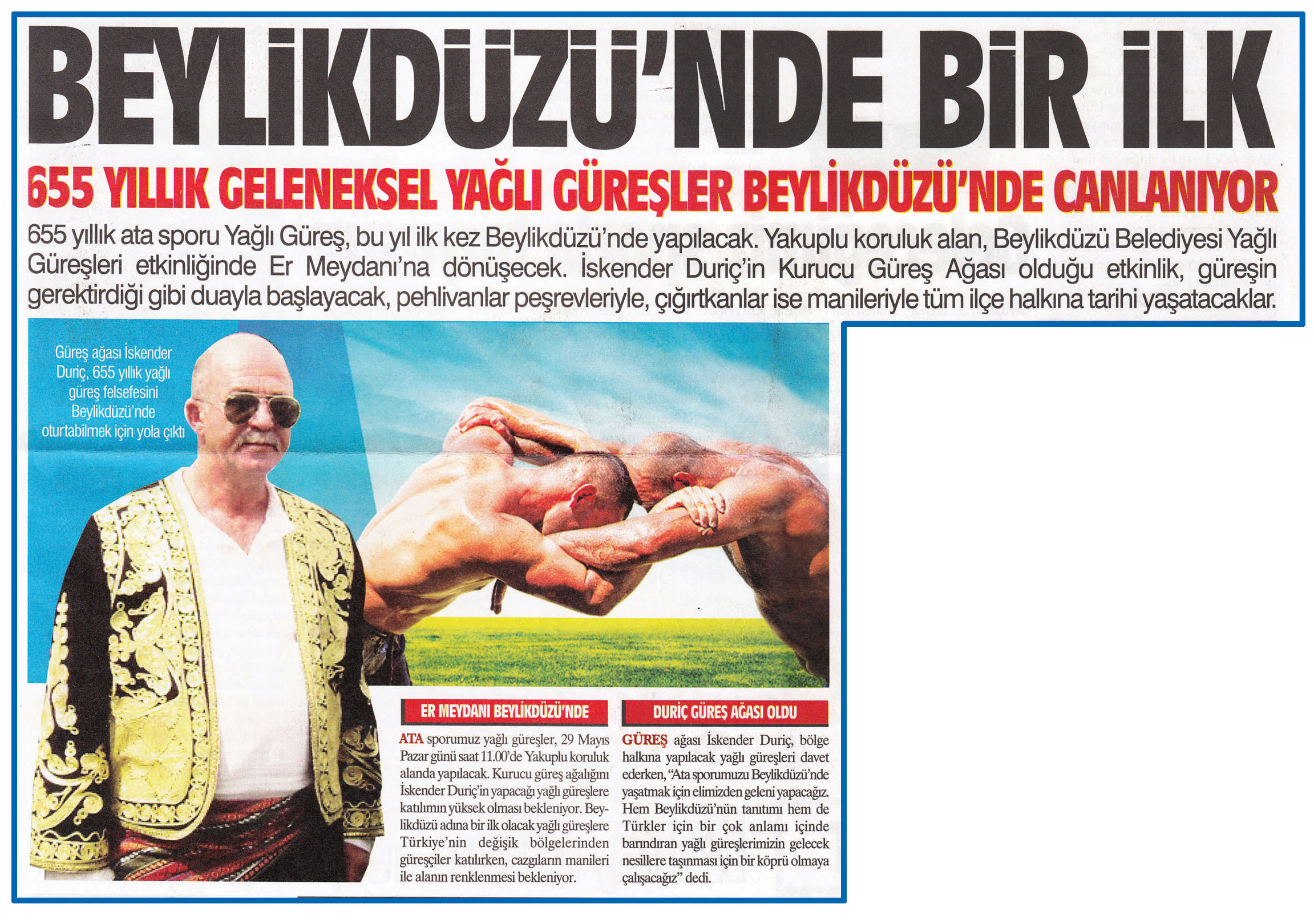 27 Mayıs 2016 tarihli "HABER EKSPRESS" gazetesi. 655 Yıllık ata sporu Yağlı Güreş, bu yıl ilk kez Beylikdüzü'nde yapılacak. Yakuplu koruluk alan, Beylikdüzü Belediyesi Yağlı Güreşleri etkinliğinde Er Meydanı'na dönüşecek.