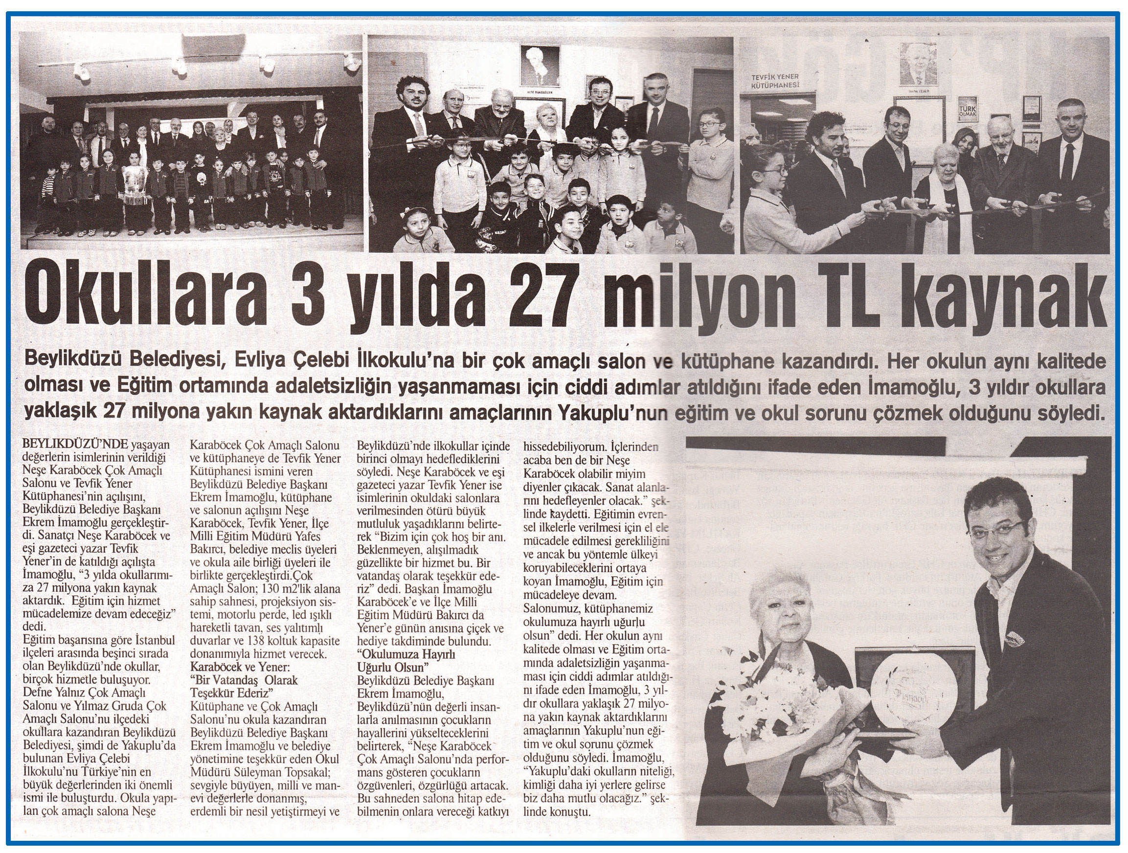 29 Kasım 2016 tarihli ''MARMARA'' gazetesi. Beylikdüzü Belediyesi, Evliya Çelebi İlkokulu'na bir çok amaçlı salon ve kütüphane kazandırdı. Her okulun aynı kalitede olması ve Eğitim ortamında adeletsizliğin yaşanmaması için ciddi adımlar atıldığını ifade eden İmamoğlu,3 yıldır okullara yaklaşık 27 milyona yakın kaynak aktardıklarını, amaçlarının Yakuplu'nun eğitim ve okul sorununu çözmek olduğunu söyledi.