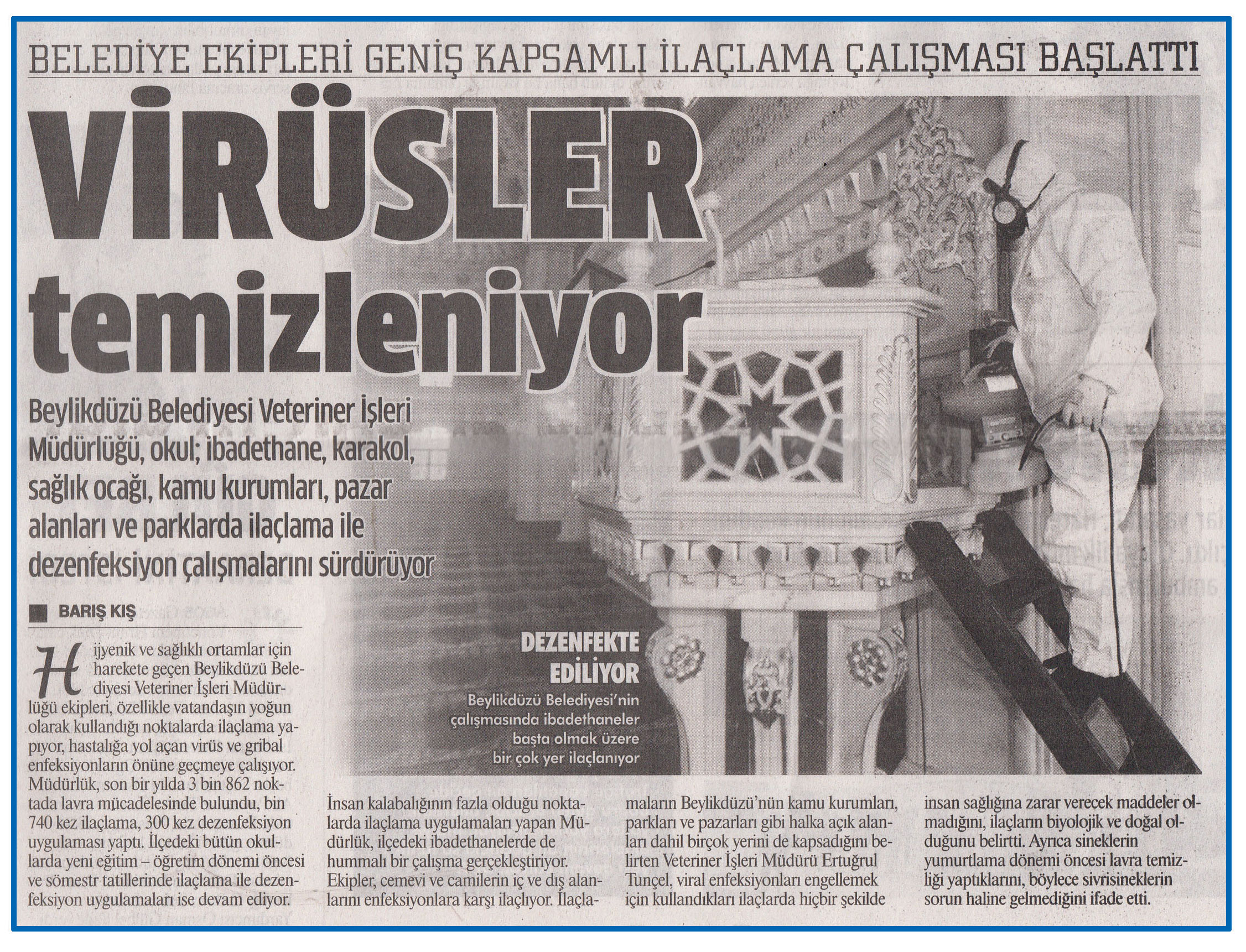 30 Kasım 2016 tarihli ''GAZETEM İSTANBUL'' gazetesi. Beylikdüzü Belediyesi Veteriner İşleri Müdürlüğü,okul; ibadethane,karakol,sağlık ocağı,kamu kurumları,pazar alanları ve parklarda ilaçlama ile dezenfeksiyon çalışmalarını sürdürüyor.