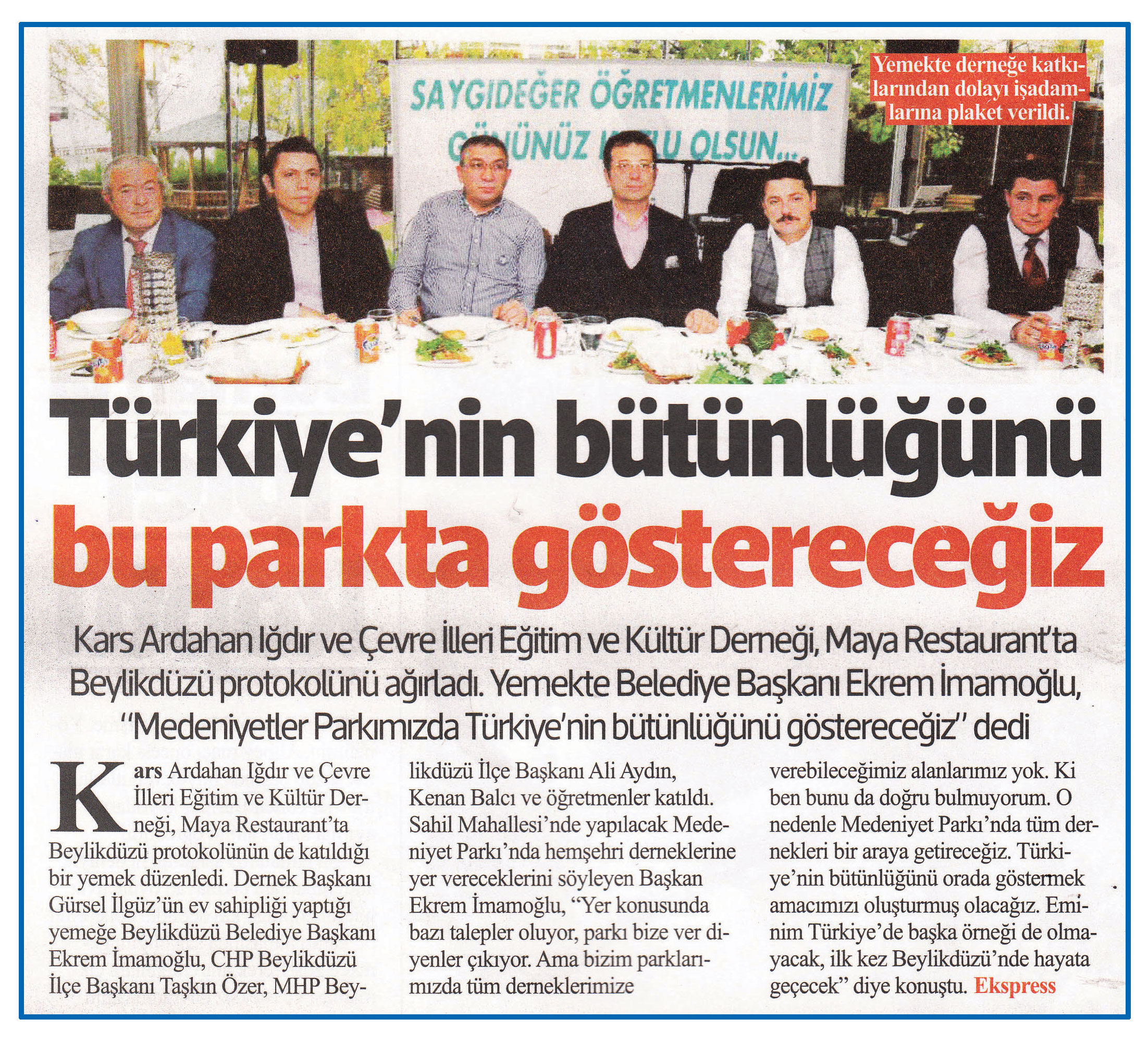 30 Kasım 2016 tarihli ''HABER EKSPRESS'' gazetesi. Kars Ardahan Iğdır ve Çevre İlleri Eğitim ve Kültür Derneği,Maya Restaurant'ta Beylikdüzü protokolünü ağırladı. Yemekte Beylikdüzü Belediye Başkanı Ekrem İmamoğlu,''Medeniyetler parkında Türkiye'nin bütünlüğünü göstereceğiz''dedi.