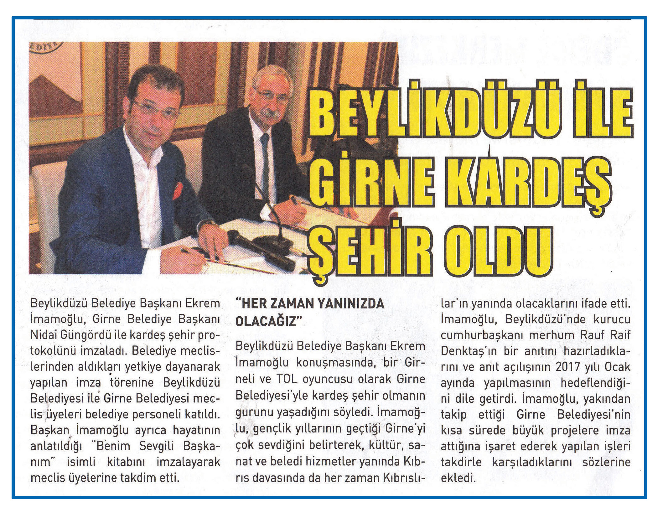 30 Kasım 2016 tarihli ''HABERVERİYORUM'' gazetesi. Beylikdüzü Belediye Başkanı Ekrem İmamoğlu,Girne Belediye Başkanı Nidai Güngördü ile kardeş şehir protokolünü imzaladı.