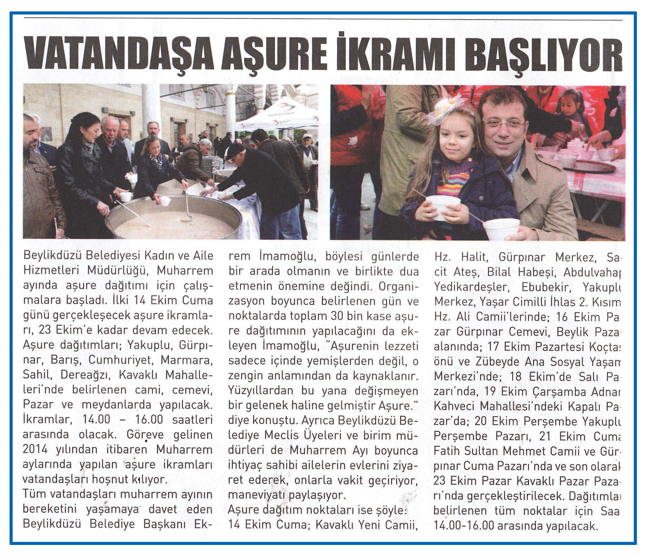 30 Kasım 2016 tarihli ''HABERVERİYORUM'' gazetesi. Beylikdüzü Belediyesi Kadın ve Aile Hizmetleri Müdürlüğü Muharrem ayında aşure dağıtımı için çalışmalara başladı.İlki 14 Ekim Cuma günü gerçekleşecek aşure ikramları 23 Ekim'e kadar devam edecek.