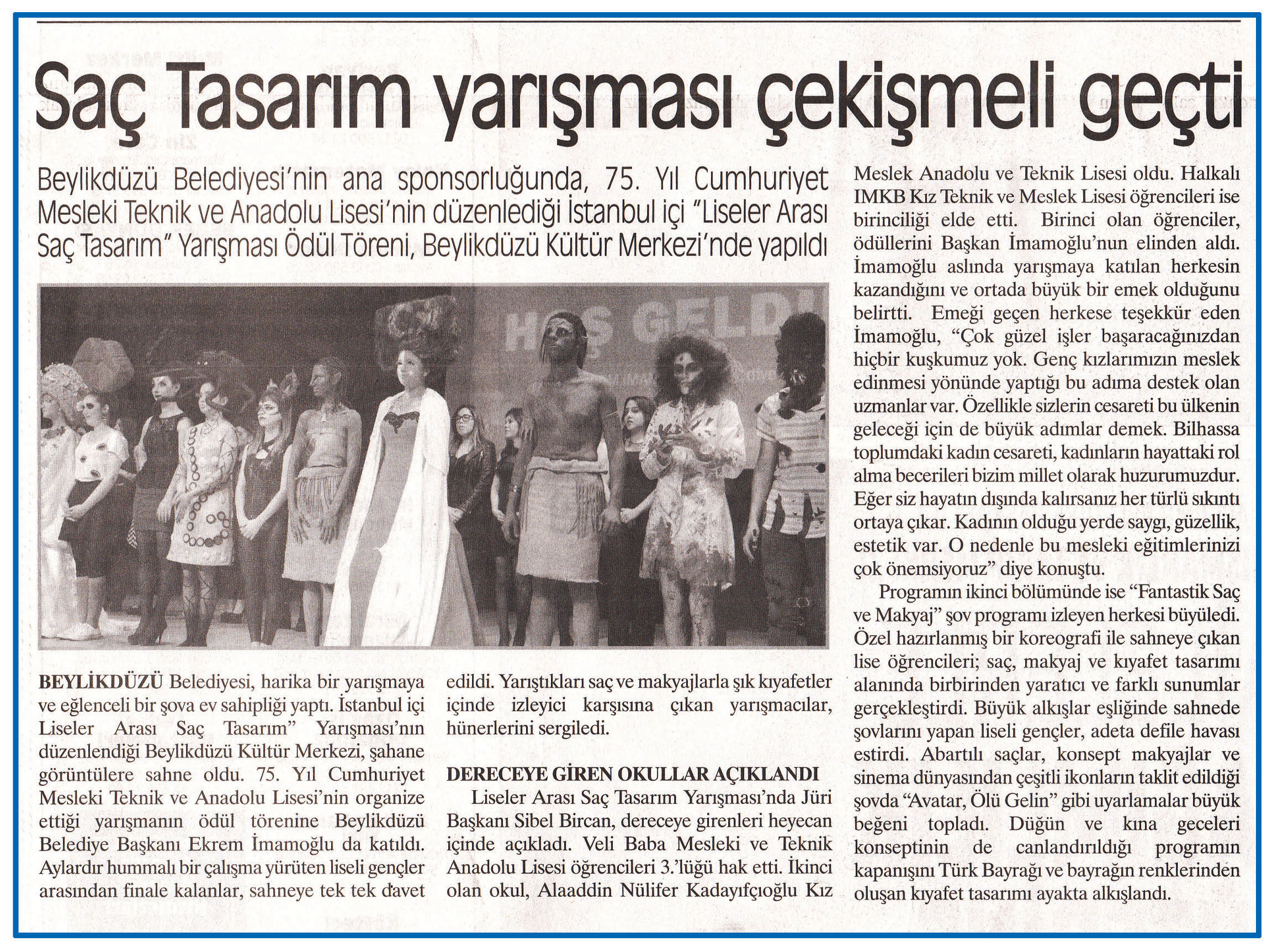 31 Mayıs 2016 tarihli "DEĞİŞİM" gazetesi. Beylikdüzü Belediyesi'nin ana sponsorluğunda, 75. Yıl Cumhuriyet Mesleki Teknik ve Anadolu Lisesi'nin düzenlediği İstanbul içi "Liseler Arası Saç Tasarım" Yarışması Ödül Töreni, Beylikdüzü Kültür Merkezi'nde yapıldı.
