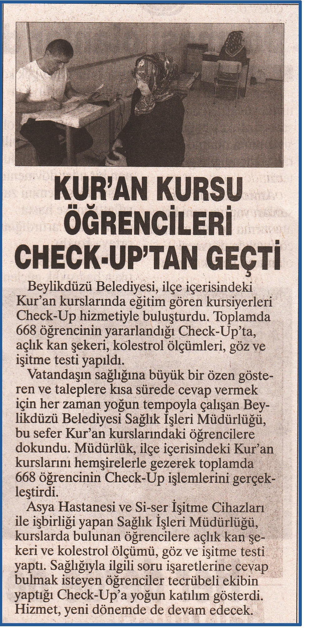 06 Haziran 2016 tarihli "BÜYÜKÇEKMECE" gazetesi. Beylikdüzü Belediyesi, ilçe içerisindeki Kur'an kurslarında eğitim gören kursiyerleri Check -Up hizmetiyle buluşturdu. Toplamda 668 öğrencinin yararlandığı Check -Up'ta, açlık kan şekeri, kolesterol ölçümleri, göz ve işitme testi yapıldı.