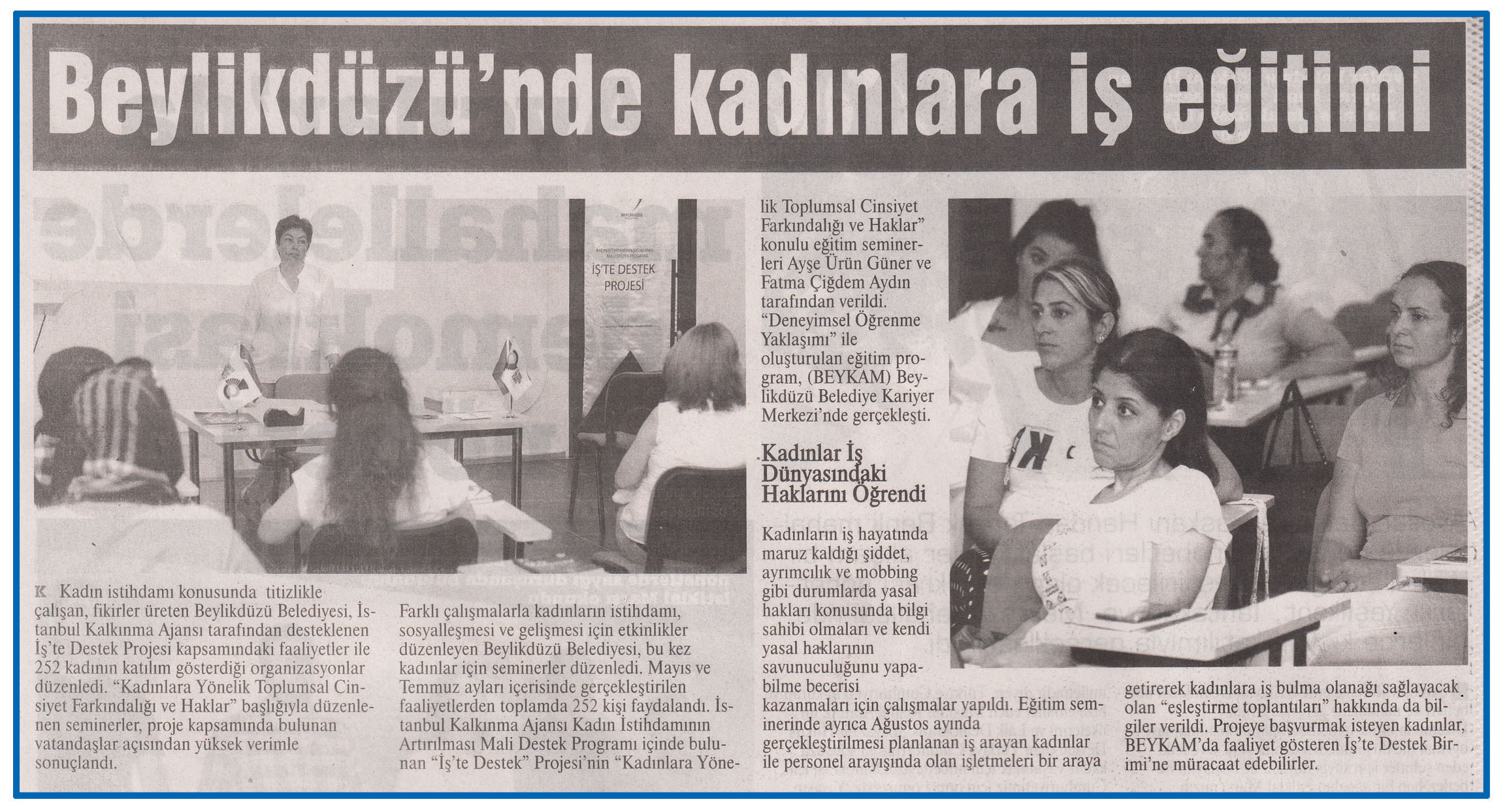 1 Ağustos 2016 tarihli ''DURUM'' gazetesi. Kadın istihdamı konusunda titizlikle çalışan, Fikirler üreten Beylikdüzü Belediyesi,İstanbul Kalkınma Ajansı tarafından desteklenen İş'te Destek projesi kapsamındaki faaliyetler ile 252 kadının katılım gösterdiği organizasyonlar düzenledi.