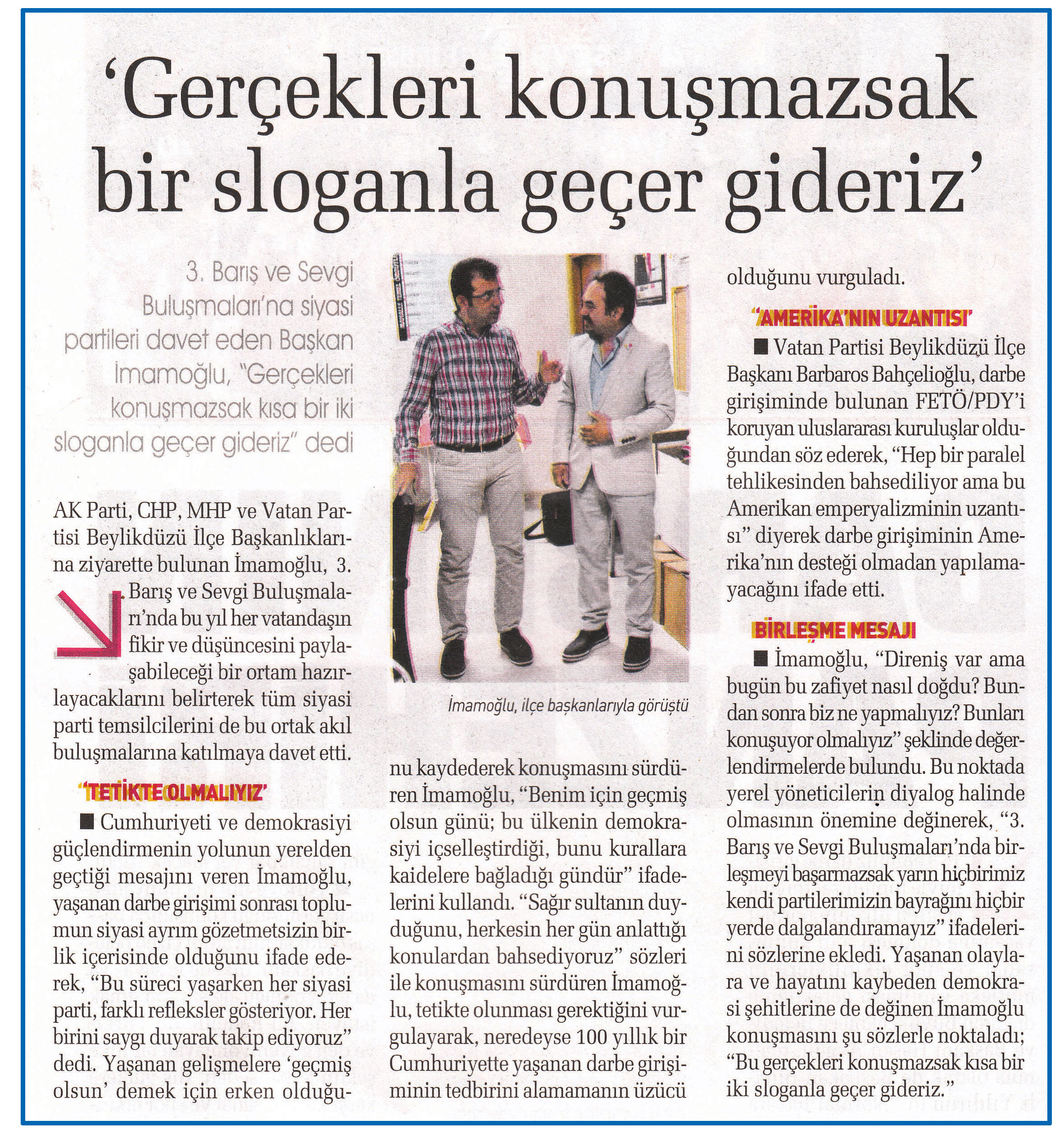 1 Ağustos 2016 tarihli ''YEREL KULİS'' gazetesi. 3. Barış ve Sevgi Buluşmaları'na siyasi partileri davet eden Başkan İmamoğlu ''Gerçekleri konuşmazsak kısa bir sloganla geçer gideriz'' dedi.