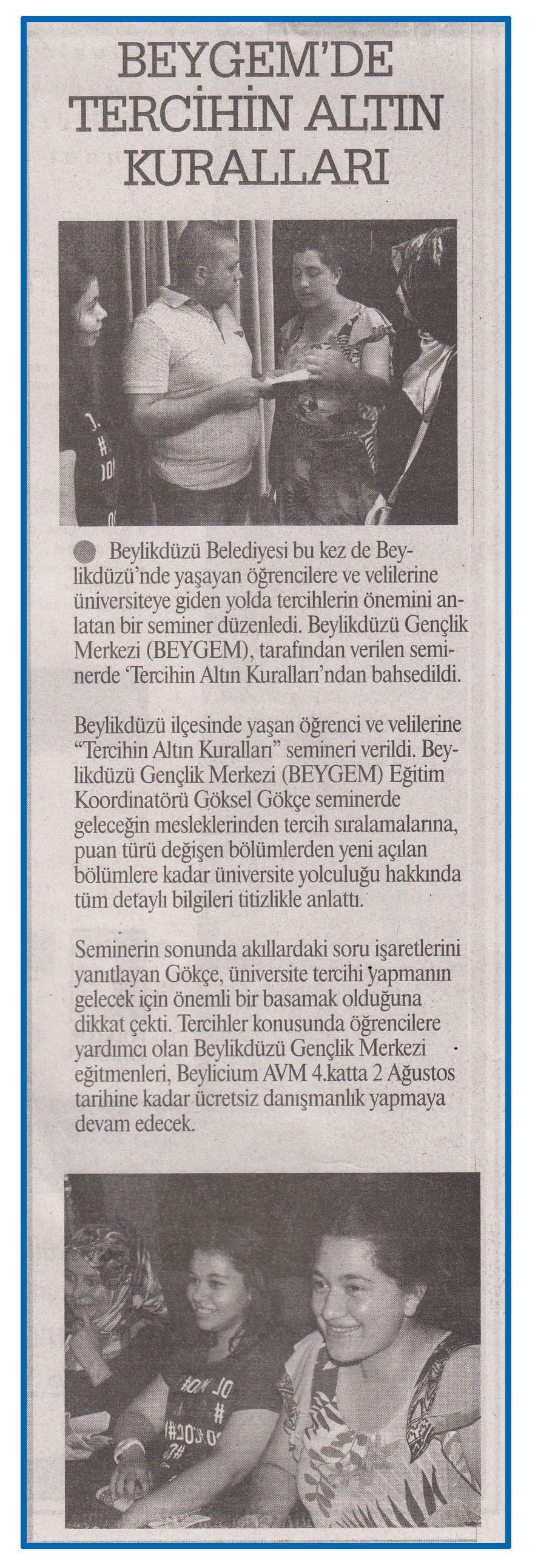 1 Ağustos 2016 tarihli ''DURUM'' gazetesi. Beylikdüzü Belediyesi bu kez de Beylikdüzü'nde yaşıyan öğrencilere ve velilerine üniversiteye giden yolda tercihlerin önemini anlatan bir seminer düzenledi.