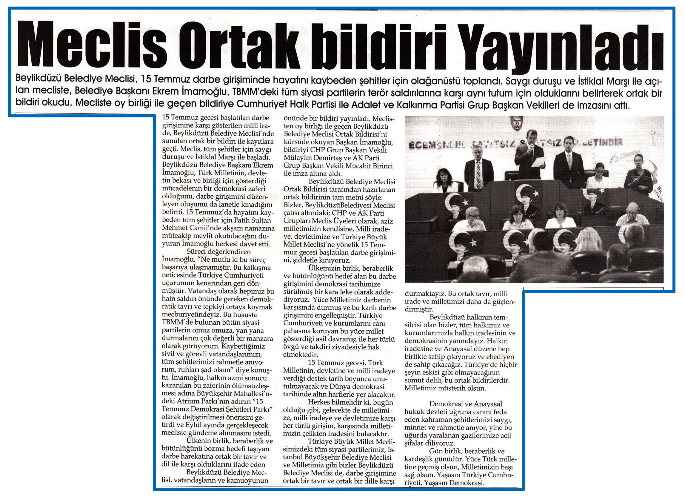 2 Ağustos 2016 tarihli ''BEYLİKDÜZÜ'' gazetesi. Beylikdüzü Belediye Meclisi,15 Temmuz darbe girişiminde hayatını kaybeden şehitler için olağanüstü toplandı.Saygı duruşu ve İstiklal Marşı ile açılan mecliste,Belediye Başkanı Ekrem İmamoğlu konuşma yaptı.