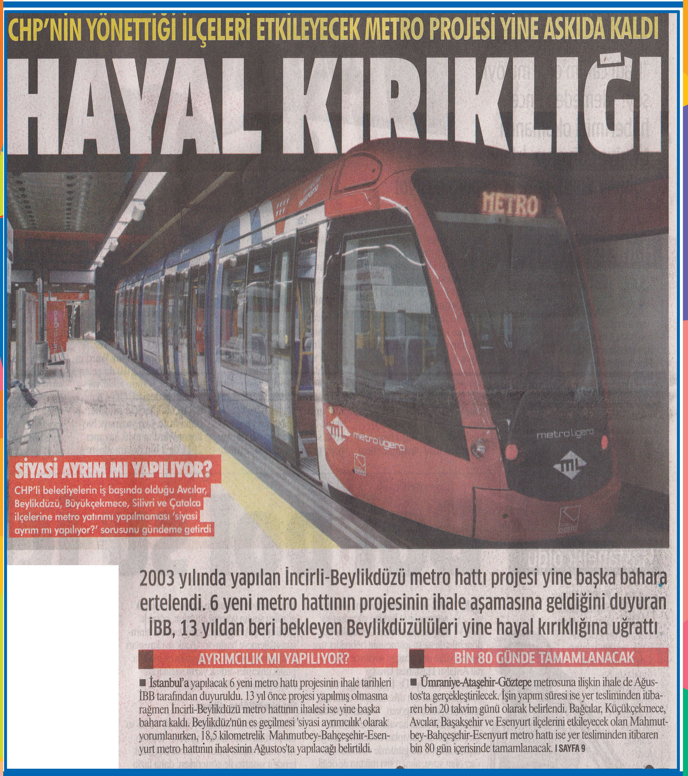 12 Temmuz 2016 tarihli "GAZETEM İSTANBUL" gazetesi. 2003 yılında yapılan İncirli-Beylikdüzü metro hattı projesi yine başka bahara ertelendi. 6 yeni metro projesinin ihale aşamasın geldiğini duyuran İBB, 13 yıldan beri bekleyen Beylikdüzülüleri yine hayal kırıklığına uğrattı.